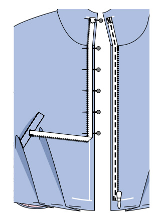Застібку-блискавку розкрити. Половинки застібки-блискавки накласти верхнім боком вниз уздовж зрізів бортів (з лицьового боку) так, щоб зубчики лежали на деталях біля розмічених ліній швів, верхні зубчики сумістити із розміченою лінією верхнього краю коміра (лінія шва).