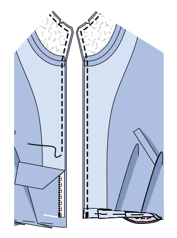 Зовнішній комір вшити в горловину куртки, внутрішній комір вшити в горловину підбортів й обшивки горловини спинки, сумістивши поперечні мітки на комірах із плечовими швами. Припуски швів надсікти на ділянках заокруглення і розпрасувати.