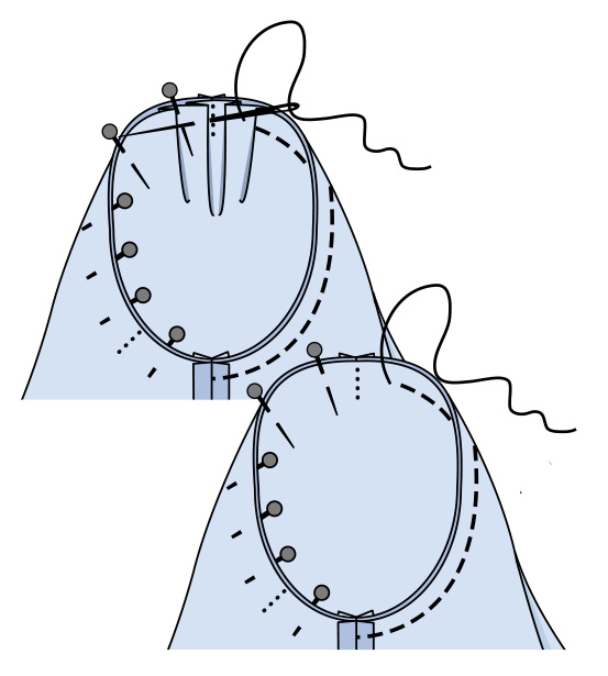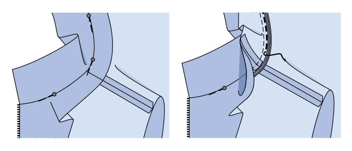 Рукави приколоти до зрізів пройм лицьовим боком до лицьового боку, сумістивши поперечні мітки 7 на рукавах і пілочках, а також шви рукавів з боковими швами. Поперечні мітки на окатах рукавів сумістити з плечовими швами. Рукави вшити. Припуски кожного шва зрізати до ширини 1 см, обметати разом і запрасувати по окату на рукав. Обшивки відігнути на виворітний бік, нижні краї рукавів припрасувати.