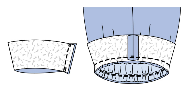 На обшивках низу рукавів виконати шви лицьовим боком усередину. Припуски швів розпрасувати. Обшивки приколоти до нижніх зрізів рукавів лицьовим боком до лицьового боку, сумістивши шви. Зрізи стягнути на нижніх нитках строчок призборювання до довжини обшивок. Кінці ниток строчок призборювання зв’язати, зборки рівномірно розподілити. Обшивки пришити. Видимі строчки призборювання видалити.