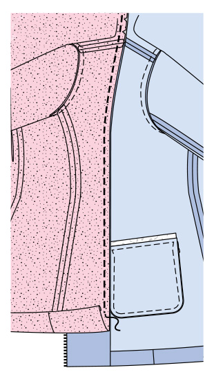 Підкладку пришити до внутрішніх зрізів підбортів і обшивки горловини спинки лицьовим боком до лицьового боку, почавши/закінчивши строчку на відстані по бл. 10 см від нижнього краю куртки.