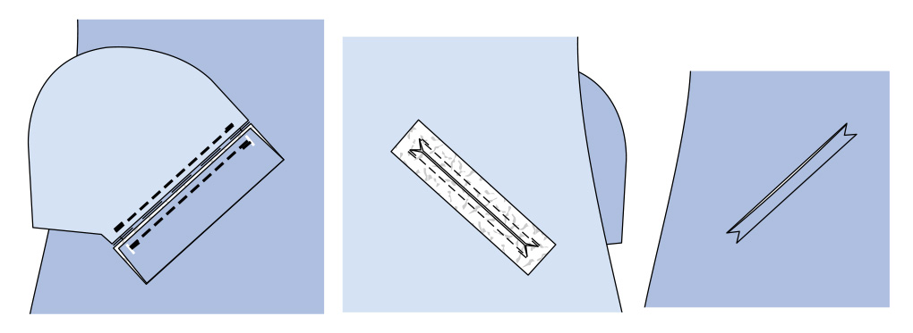 Підборти і низ зшити до кінців підбортів, далі сколоти і зшити верхні зрізи комірів. Припуски швів зрізати близько до строчок. Борти припрасувати, зубчики виступають. Верхній край коміра припрасувати. Сколоти шви вшивання комірів. З виворітного боку припуски швів зшити впритул до сколених швів на максимально можливу довжину. Підборти й обшивку горловини спинки відігнути на виворітний бік.