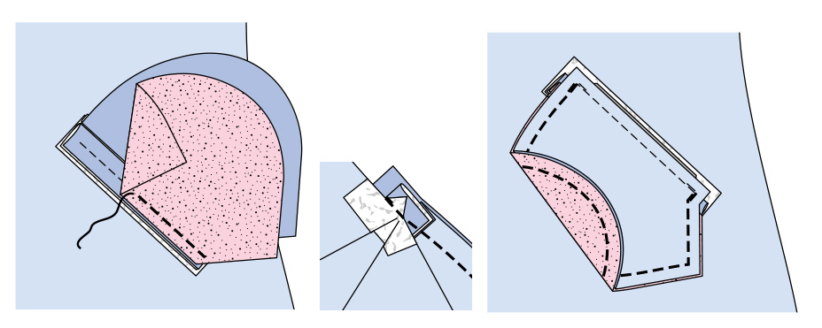 Прокладка: припрасувати до деталей 3–5, 11 і 12 з виворітного боку. З виворітного боку поверх розмічених ліній кишень припрасувати смуги прокладки завширшки по бл. 4 см.