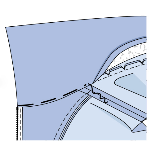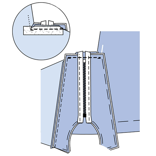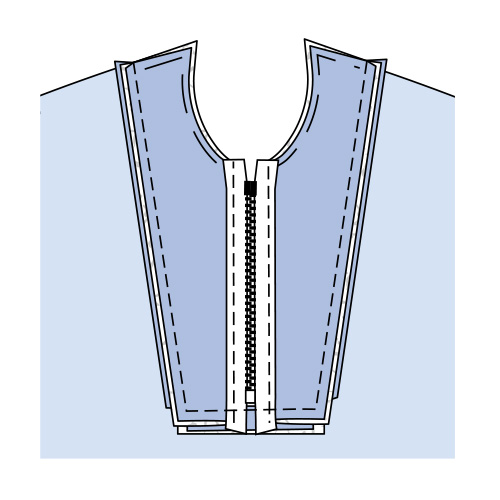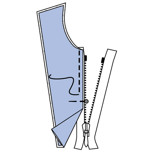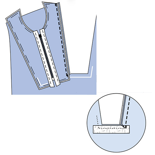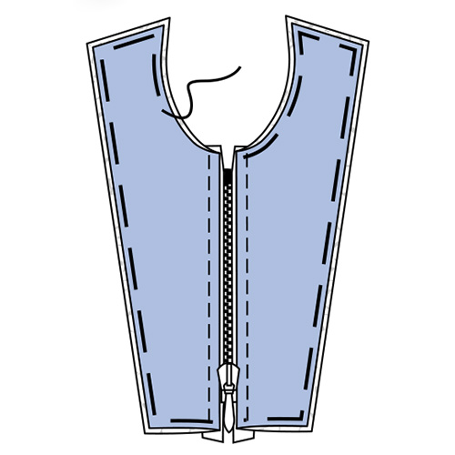 Вставки переду скласти по лініях згинів виворітним боком усередину, відкриті припуски зметати. Розкриту застібку-блискавку підкласти під згин однієї деталі вставки переду від лінії горловини так, щоб зубчики було видно. Застібку-блискавку приметати і пришити, проклавши строчку вздовж згину (лапка швацької машини для пришивання застібок-блискавок і кантів).
