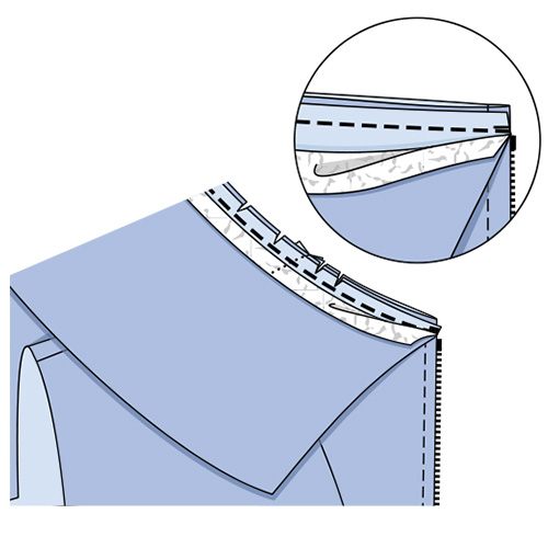 Припуски шва зрізати близько до строчки і запрасувати на комір. Нижній зріз верхнього коміра підігнути і приметати поверх шва вшивання нижнього коміра. З лицьового боку прокласти строчку точно в шов вшивання коміра, закріплюючи внутрішній.