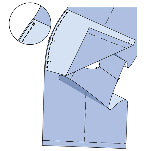 Рукави пришити до зрізів пройм лицьовим боком до лицьового боку, почавши/закінчивши строчки точно біля поперечних міток. Припуски кожного шва обметати разом і запрасувати на перед/спинку.