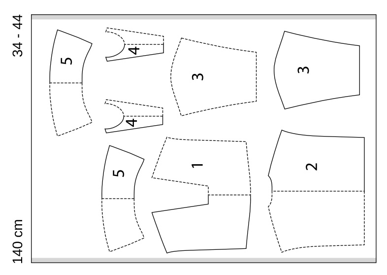 В’язане/трикотажне полотно розкласти в один шар лицьовим боком угору. Деталі, позначені на планах розкладки пунктирними лініями, накласти на тканину боком з написами вниз. Парні деталі 3 викроїти симетрично. Деталі 1, 2, 4 і 5 накреслити від ліній згинів симетрично.