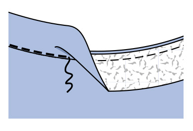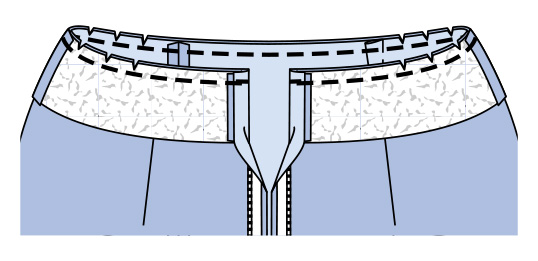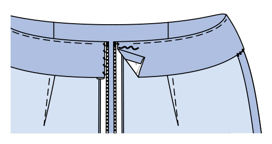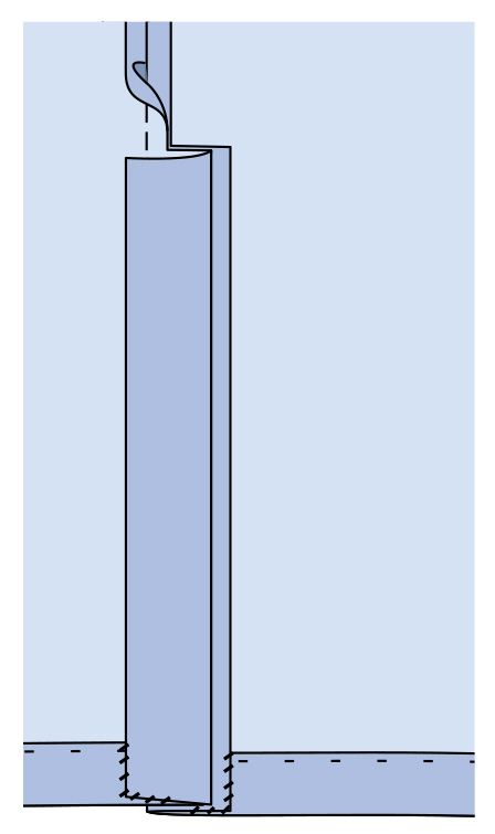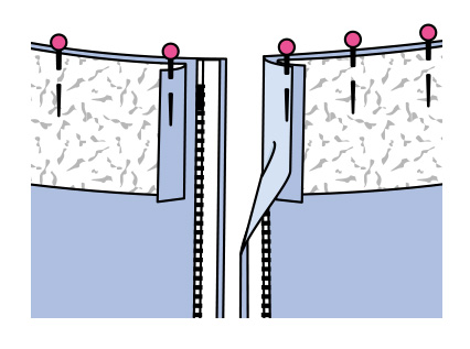 Припуски шва зрізати близько до строчки, на ділянках округлення надсікти. Обшивку відігнути вгору і настрочити на припуски шва пришивання близько до шва на максимально можливу довжину.