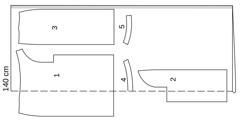 Тканину скласти вдвічі лицьовим боком усередину. Деталі 1 і 2 викроїти в останню чергу з розкладеного в один шар клаптя тканини. Ці деталі накласти на лицьовий бік тканини боком із написами вгору.