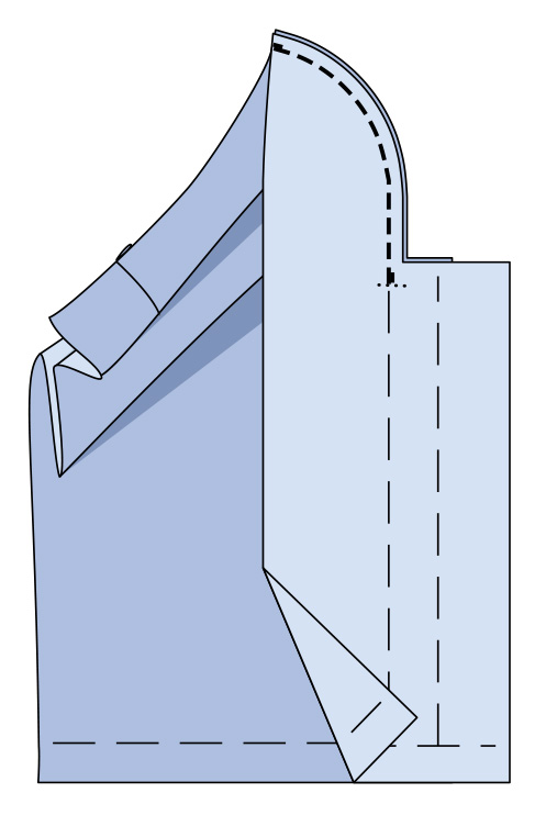 Передні полотнища скласти лицьовими боками, сколоти і зшити рельєфні зрізи від верху до мітки шліци.