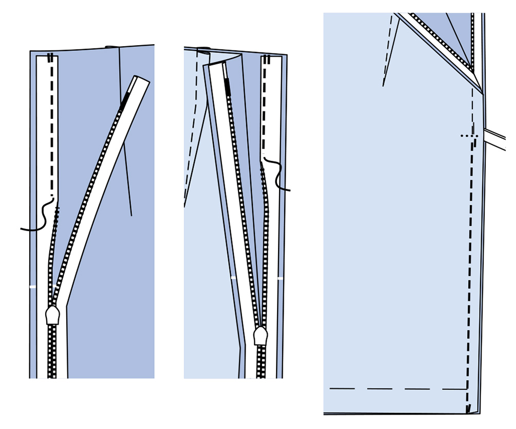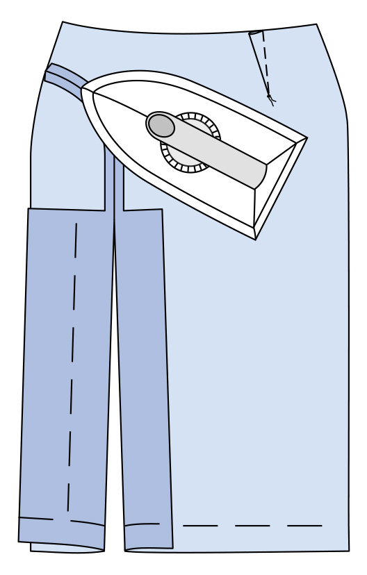 Обшивку відігнути на виворітний бік, верхній край спідниці припрасувати. Кінці обшивки підігнути і пришити до тасьм застібки-блискавки. Нижній зріз обшивки пришити до припусків швів.