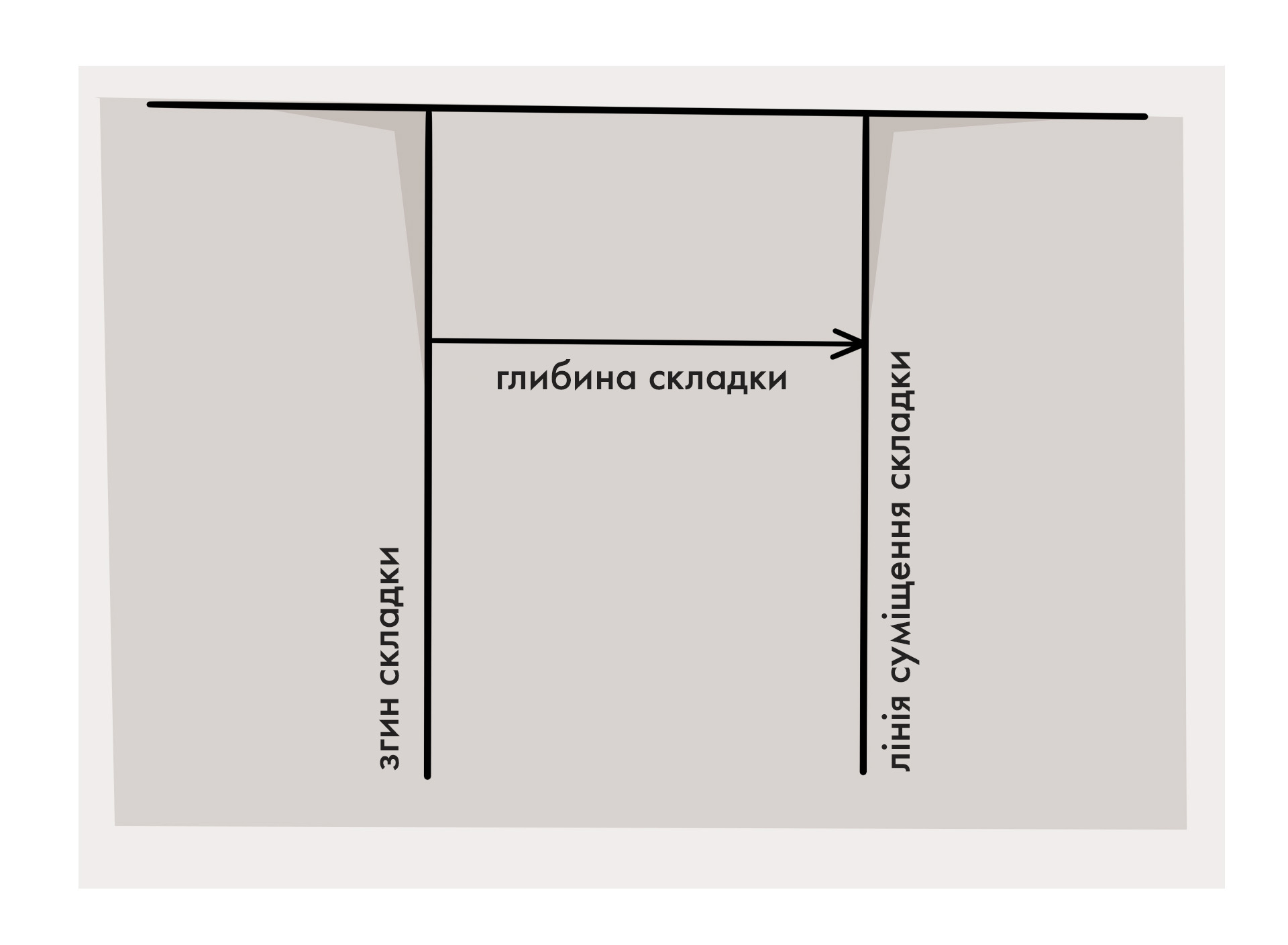 Лінія біля початку мітки-стрілки складки позначає згин, а лінія біля кінчика складки-стрілки – лінію суміщення. Відстань між ними складає глибину складки. Обидві лінії слід перенести за допомогою лінійки і копіювального коліщатка на виворітний бік тканини. Щоб лінії були видні й з лицьового боку, вздовж цих ліній прокласти великі зметувальні стібки.