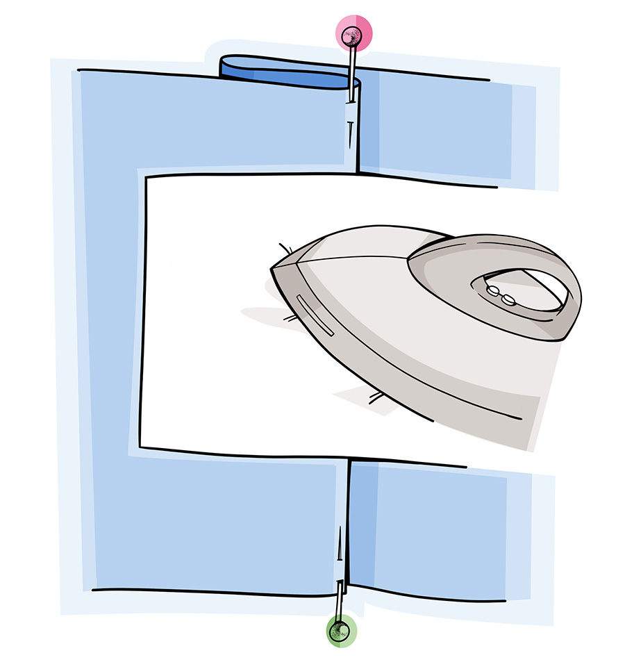 Тканину розкласти лицьовим боком угору на прасувальній дошці. Складки закласти у напрямі міток-стрілок, угорі та знизу складки приколоти по лінії суміщення. Складки запрасувати під пропрасовувачем.