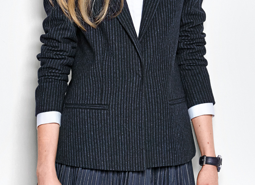 Приталений жакет з вузькими довгими лацканами запозичив у чоловічого піджака не тільки «серйозну» тканину в тонку смужку, а й такі деталі, як прорізні кишені - нижні в рамку й одна з листочкою на рівні грудей. Позаду - дві шліци в рельєфних швах.