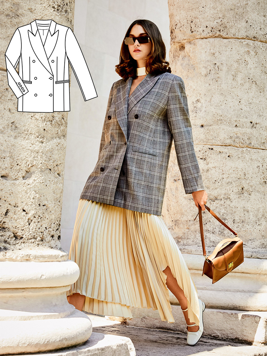 Цей двобортний блейзер з гострими лацканами і прорізними кишенями в рамку має дуже модний вигляд в такій стилізації з плісированою спідницею. Але до строгих штанів у діловому стилі пасуватиме також бездоганно.