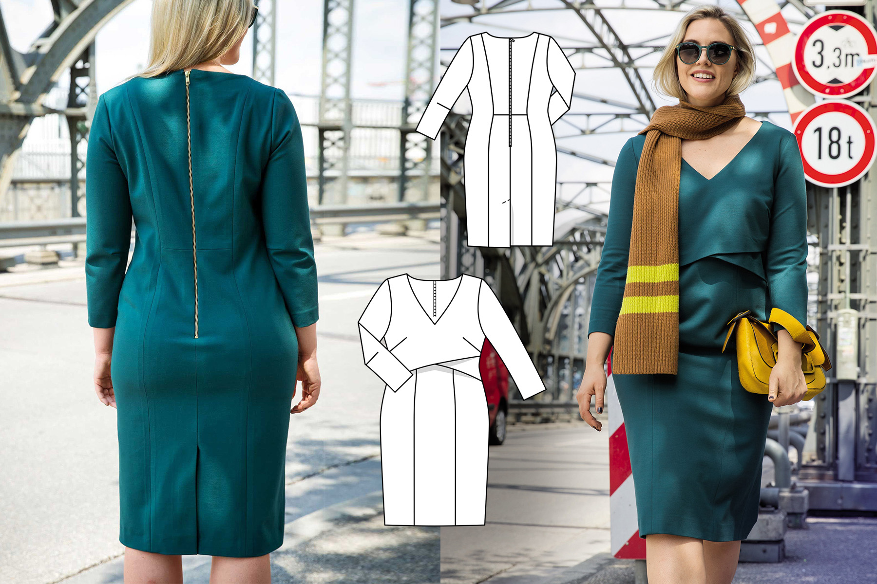 Металева блискавка на спинці – прикмета спортивного стилю у цій моделі. В усьому іншому ця трикотажна сукня з V-подібною горловиною демонструє елегантність. Асиметричні зовнішні деталі ліфа створюють ілюзію короткого топа, скомбінованого зі спідницею.