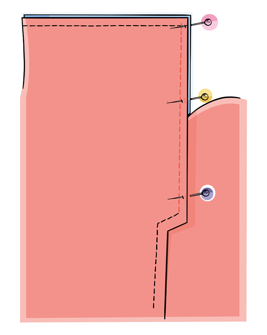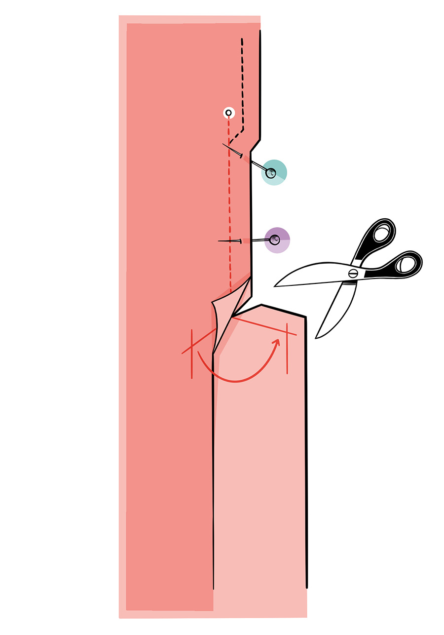 3. Підкладку пришити вздовж краю шліци до кінця шва з кроку 2. Шви припрасувати. Спинку підкладки відігнути біля скосу шліци у напрямі низу і виконати надсічку в куті.