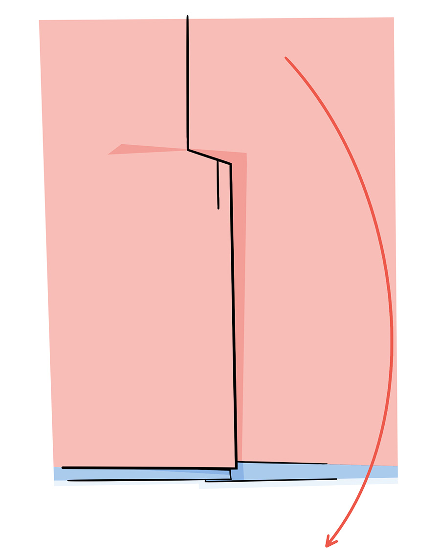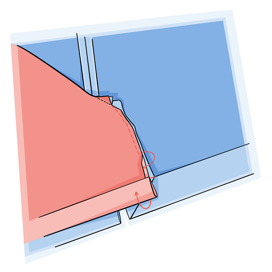 5. Щоб шліца не зміщувалася під час ходіння, підкладку відігнути на виворітний бік — виворітним боком до виворітного боку. Далі підкладку відігнути так, щоб припуски косого короткого шва (верхній кінець шліци) лежали відкритими. Припуски шліци з основної тканини і підкладки на цій короткій ділянці зшити.