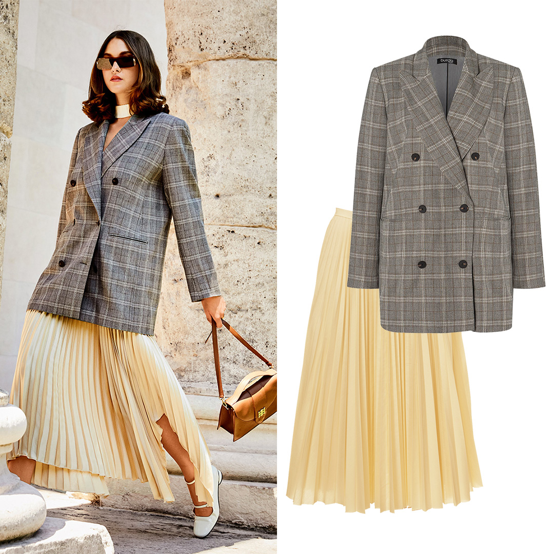 Цей двобортний блейзер з гострими лацканами і прорізними кишенями в рамку має дуже модний вигляд в такій стилізації з плісированою спідницею. Але до строгих штанів у діловому стилі пасуватиме також бездоганно.