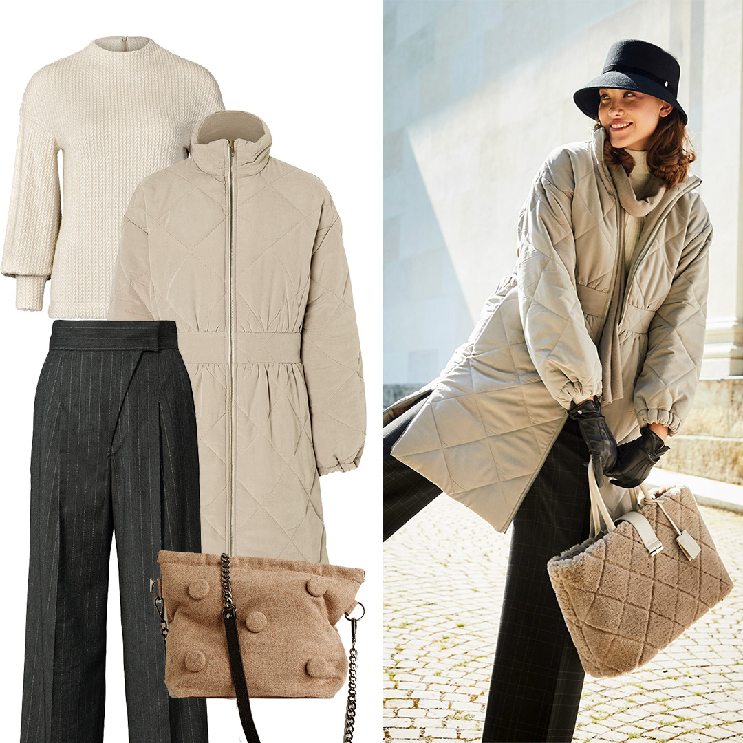 Стьобане пальто для леді: вшивний пояс створює силует пісочного годинника. Застібки-блискавки в бокових швах відкривають розрізи, високий комір і куліски на рукавах роблять пальто затишним і вітронепроникним. Штани марлен зачаровують, а також роблять фігуру стрункою завдяки широкому, високо посадженому поясу.