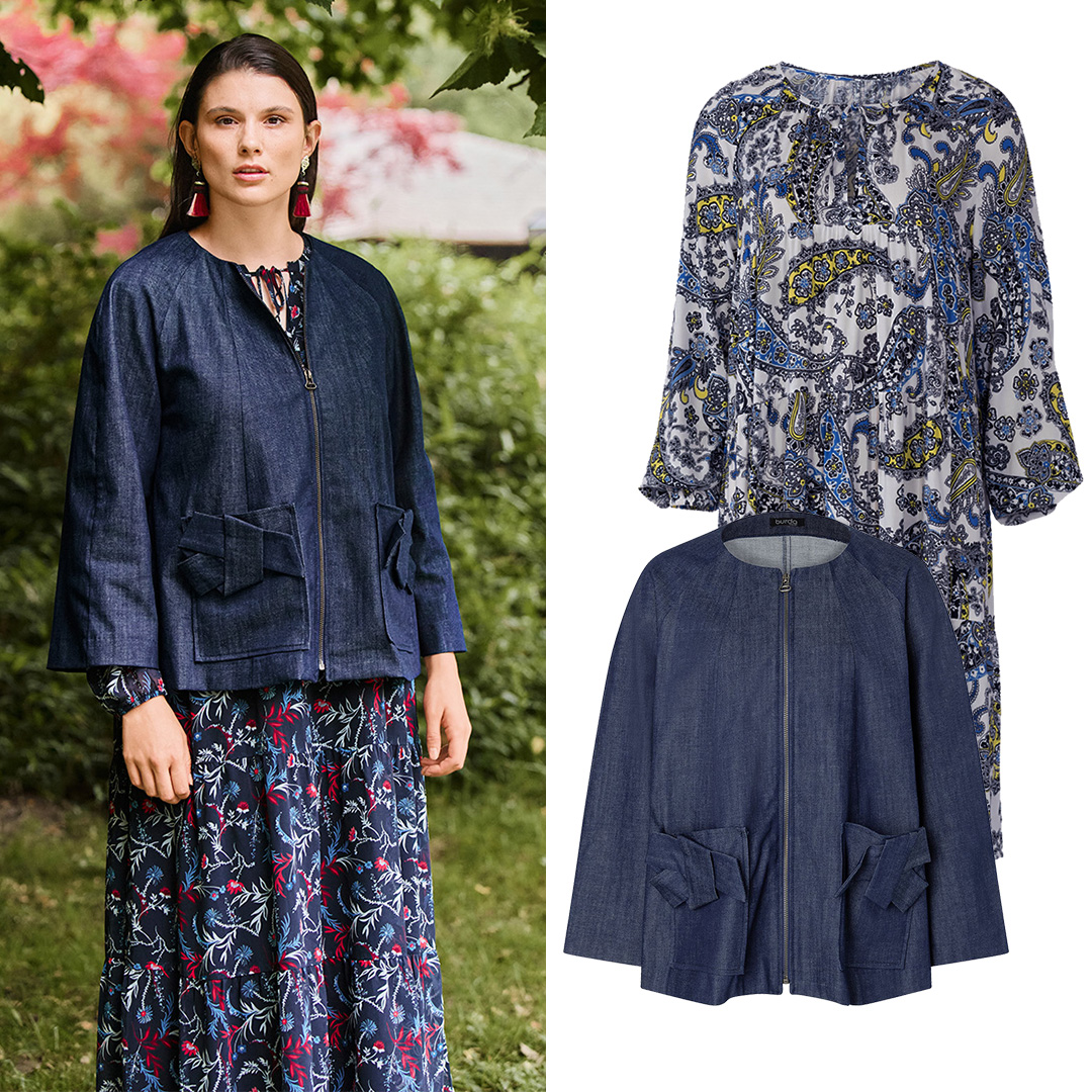 Ця куртка зовсім нова й особлива: якісна джинсова тканина в поєднанні з незвичним кроєм у формі дзвона і вишуканими кишенями у стилі оригамі.