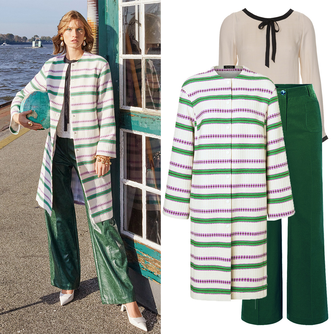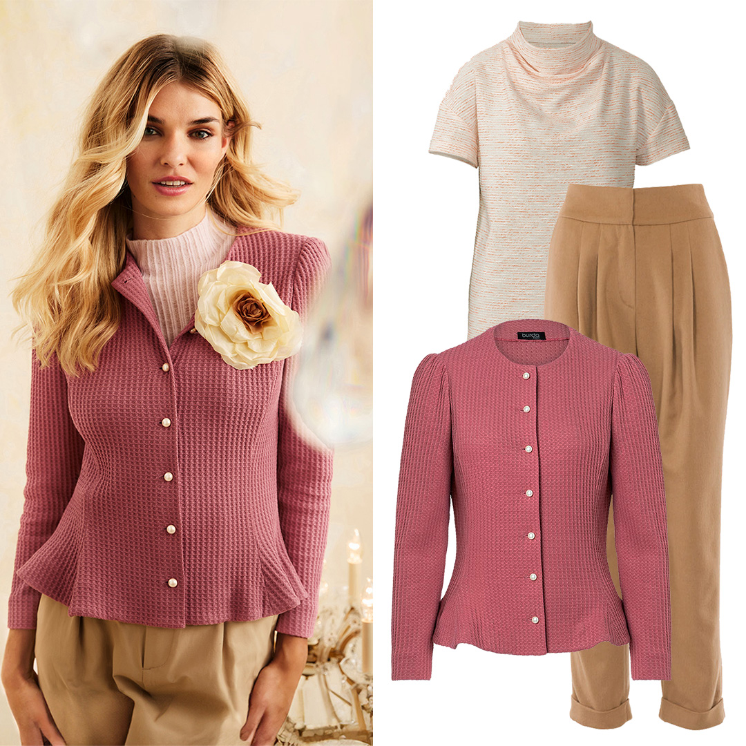 У цьому сезоні кардигани також дуже жіночні: як ця приталена модель із суцільнокроєною баскою, акуратними рукавами-буфами та елегантними перламутровими ґудзиками. Завужені донизу велюрові штани завдовжки 7/8 із широким фасонним поясом і пришивними одворотами приваблюють своїм невимушеним шиком. Щоб складки біля пояса не повнили, вони застрочені вниз на декілька сантиметрів.