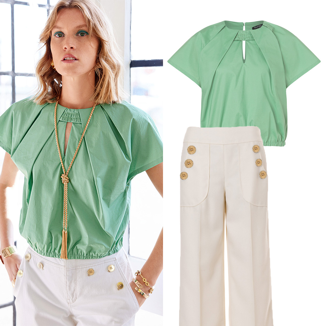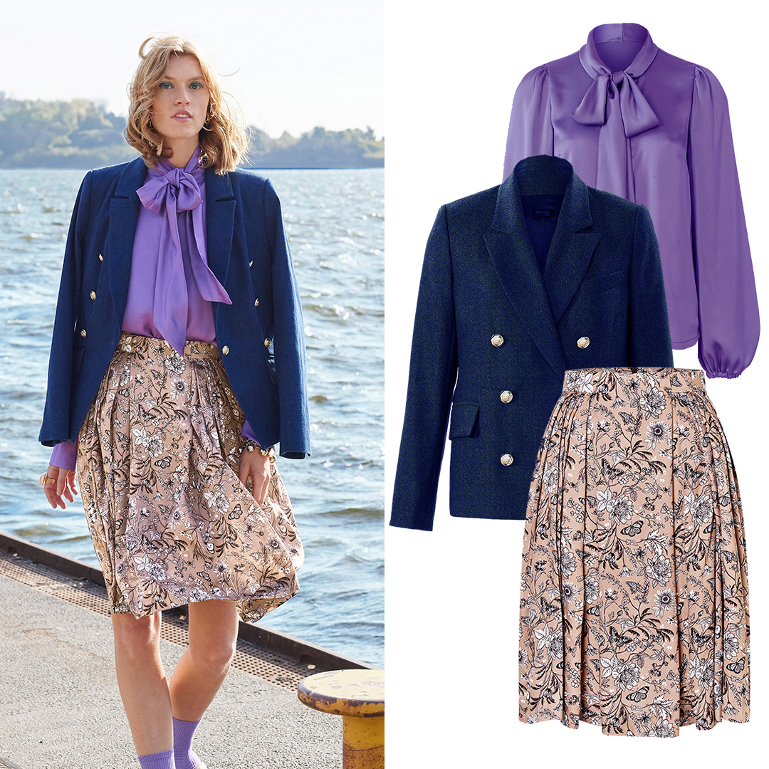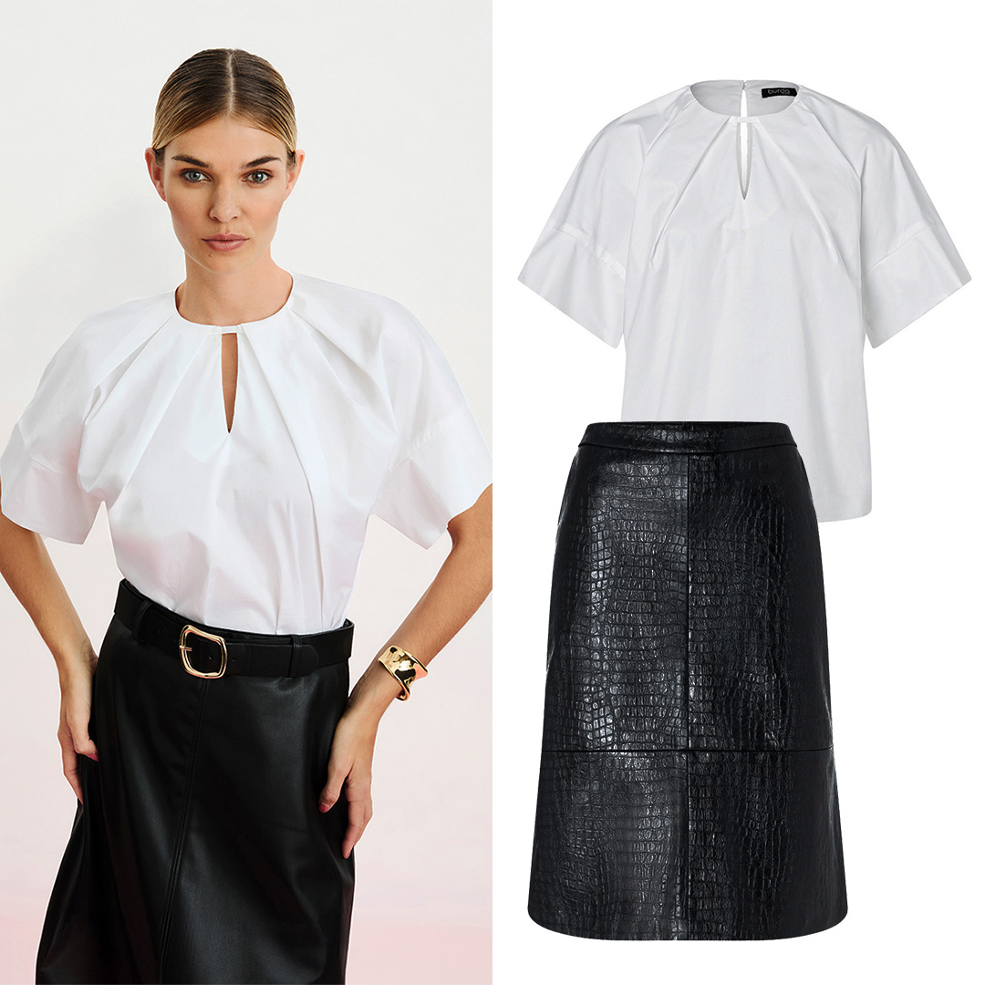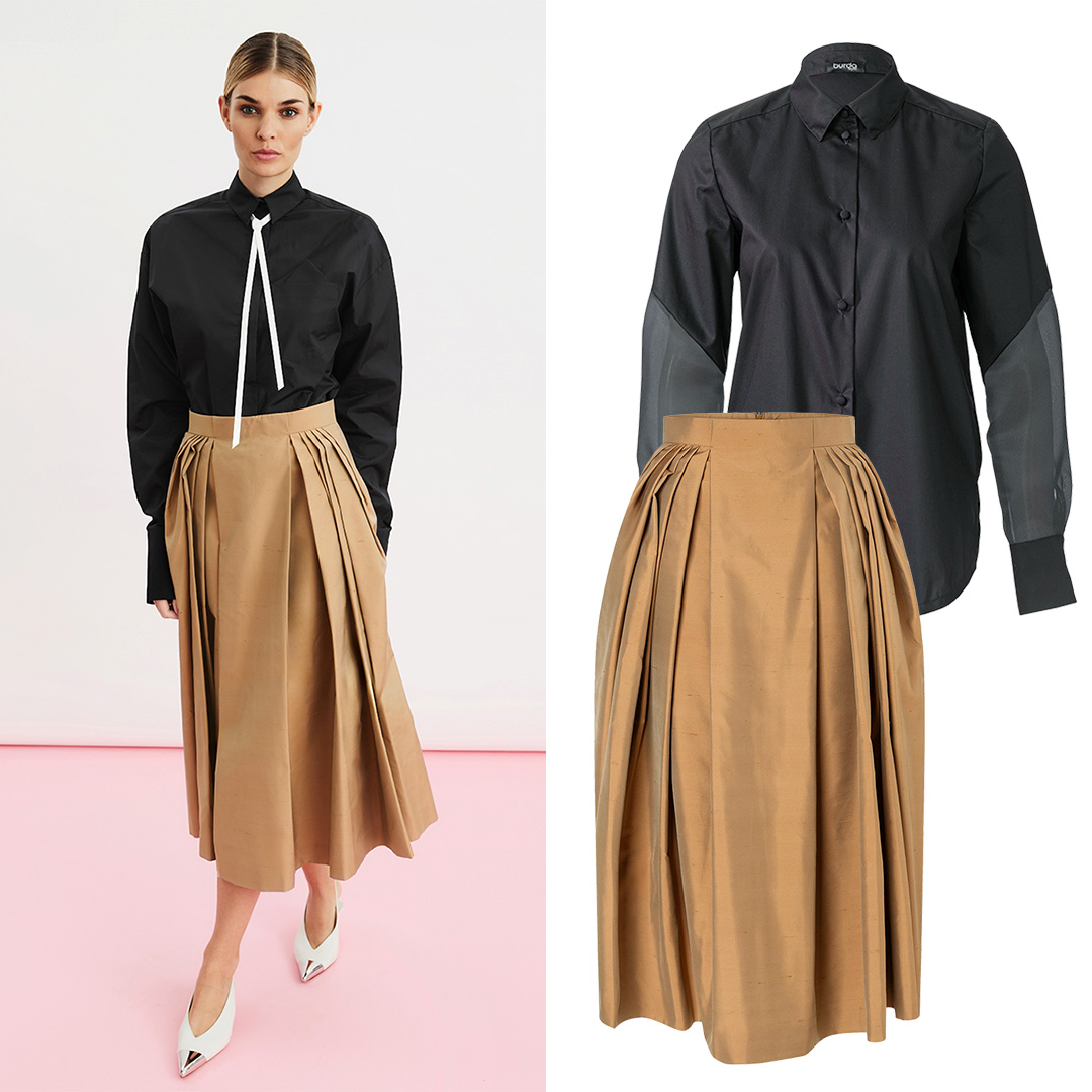 Від міні до максі: різна глибина складок не просто додає динаміки, а й робить спідницю схожою на дизайнерську з паризьких подіумів. Витончена деталь: широка складка спереду, яка перекриває пояс. Захоплива гра протилежностей: частково виконані з органзи рукави створюють делікатну прозорість і додають досить строгій блузці легкого шарму і жіночності.