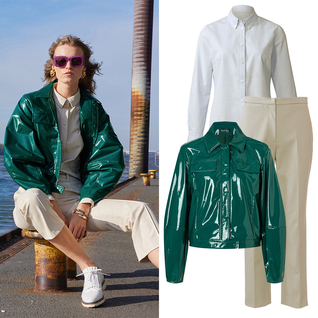 Модель, за кроєм, як джинсова куртка з «кутюрними» рукавами, підкреслить будь-яке вбрання, навіть найпростіше, і не в останню чергу завдяки екстравагантній штучній лаковій шкірі. Якщо надаєте перевагу більш елегантному вигляду, викроїть куртку з жакардової тканини або букле. Штани з акуратними стрілками і кишенями з листочками ідеально сидять і надають лоску вашому образу