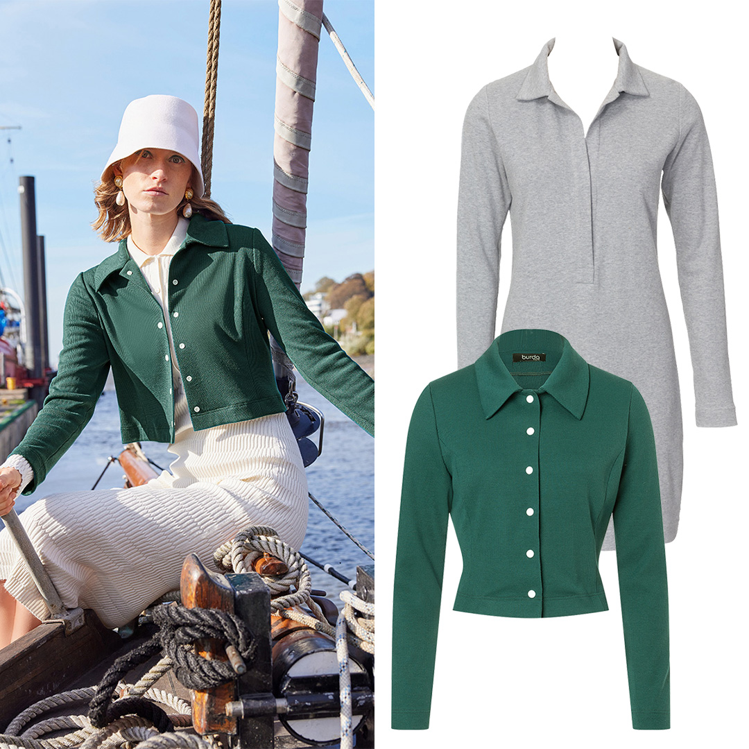 Такий чудовий кардиган із широкими відкладним коміром і контрастними кнопками просто незамінний навесні! Віддаєте перевагу більшій довжині? Просто подовжте викрійку. Сукня з трикотажного полотна красиво облягає фігуру. Завдяки вирізу а-ля поло сукня здається спортивною і в той же час елегантною.