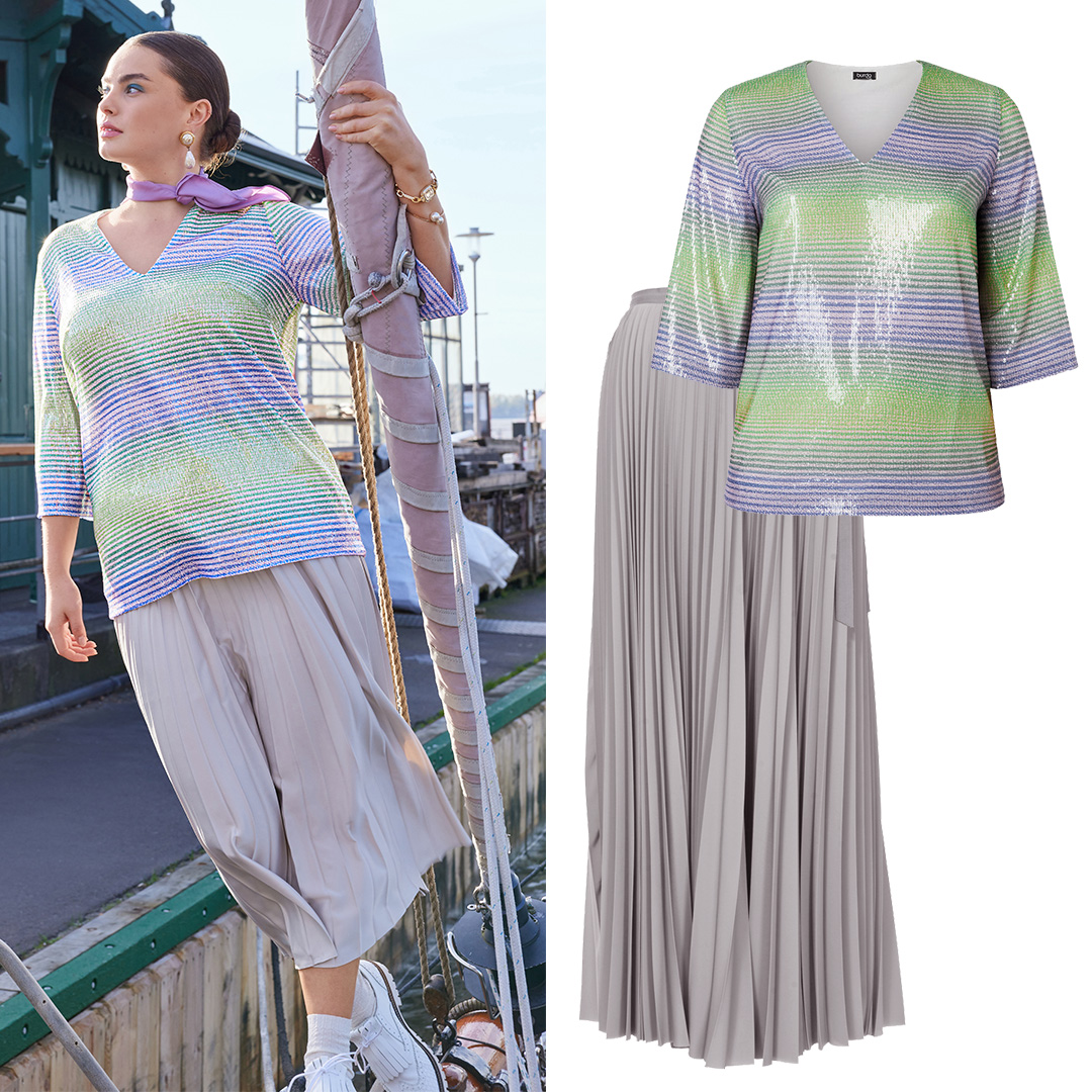 Пайєтки для повсякдення? Звичайно, якщо модель має такий простий крій, як у цієї блузи з V-подібним вирізом і рукавами 3/4. Довга спідниця сонце-кльош кроїться за кресленням, а гофре можна зробити в майстерні.