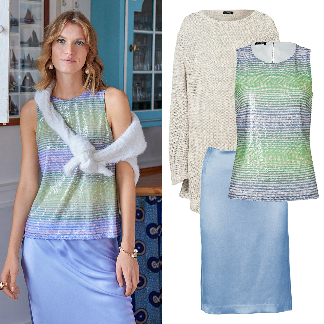 Ідеально для пайєток або тканини зі складним візерунком: ця модель не має жодного рельєфного шва, а отже, демонструє матеріал у всій красі. Щоб спростити собі задачу, можна використати тканину з «пласкими» пайєтками, як у нас, по якій можна легко шити.