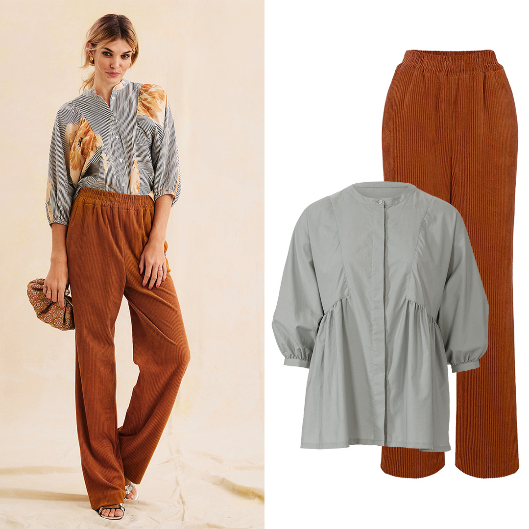 Широкий еластичний пояс робить штани не тільки зручними, завдяки зборкам він ніби «оживляє» комфортну і м’яку вельветову тканину. Модель легко і швидко шиється, тому ідеальна для початківців. Оригінальний крій сорочки з екстравеликими проймами, що проходять через груди і талію, гідний особливої уваги.