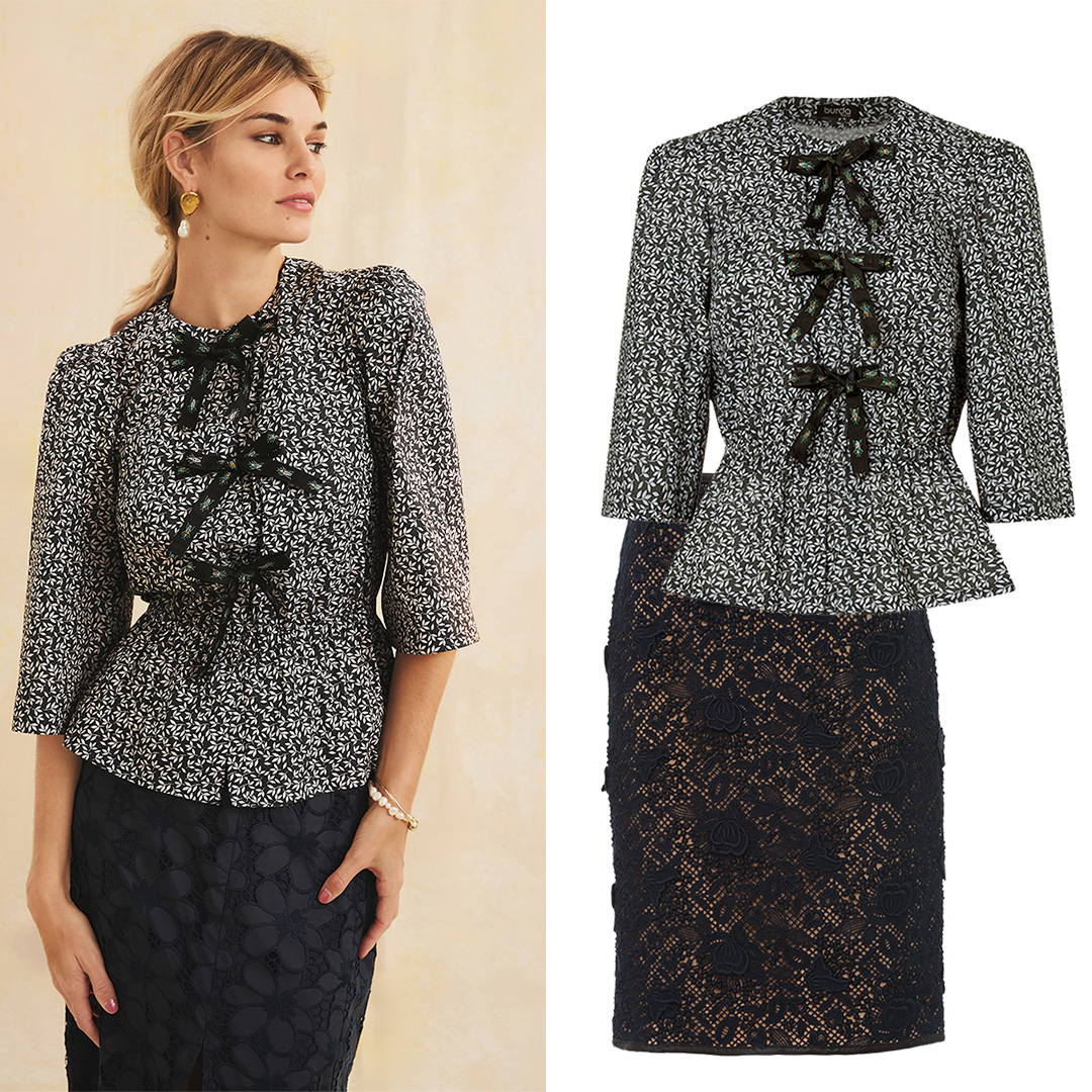 Ніжна блузка із застібкою на гачки, але основна увага тут прикута до бантів, нашитих в якості оздоблення. Порада: банти можна не пришивати, а зробити пристібними на кнопках чи булавках для брошок. Тоді, в залежності від вашого настрою чи нагоди, блузку можна вдягати і без них. Чудове доповнення до блузки - мереживна спідниця-олівець.