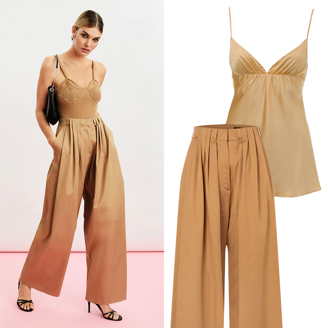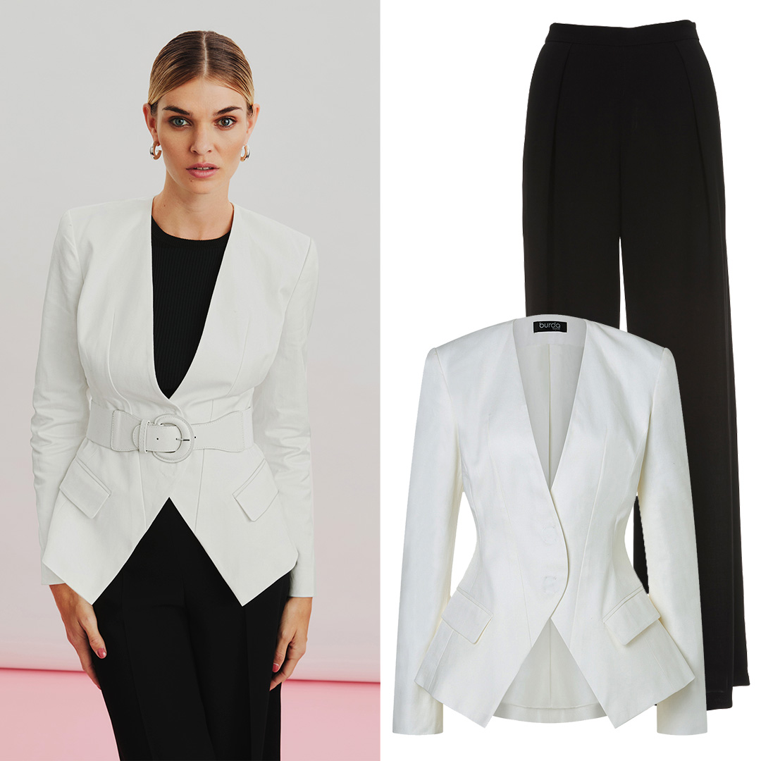 Блейзер у стилі Діор з чіткими лініями і фігурними швами підкреслює талію і створює силует пісочного годинника. Ремінь - додатковий акцент. Широкі штани з високою посадкою і глибокими складками спереду - подібним надавала перевагу сама Марлен Дітріх!