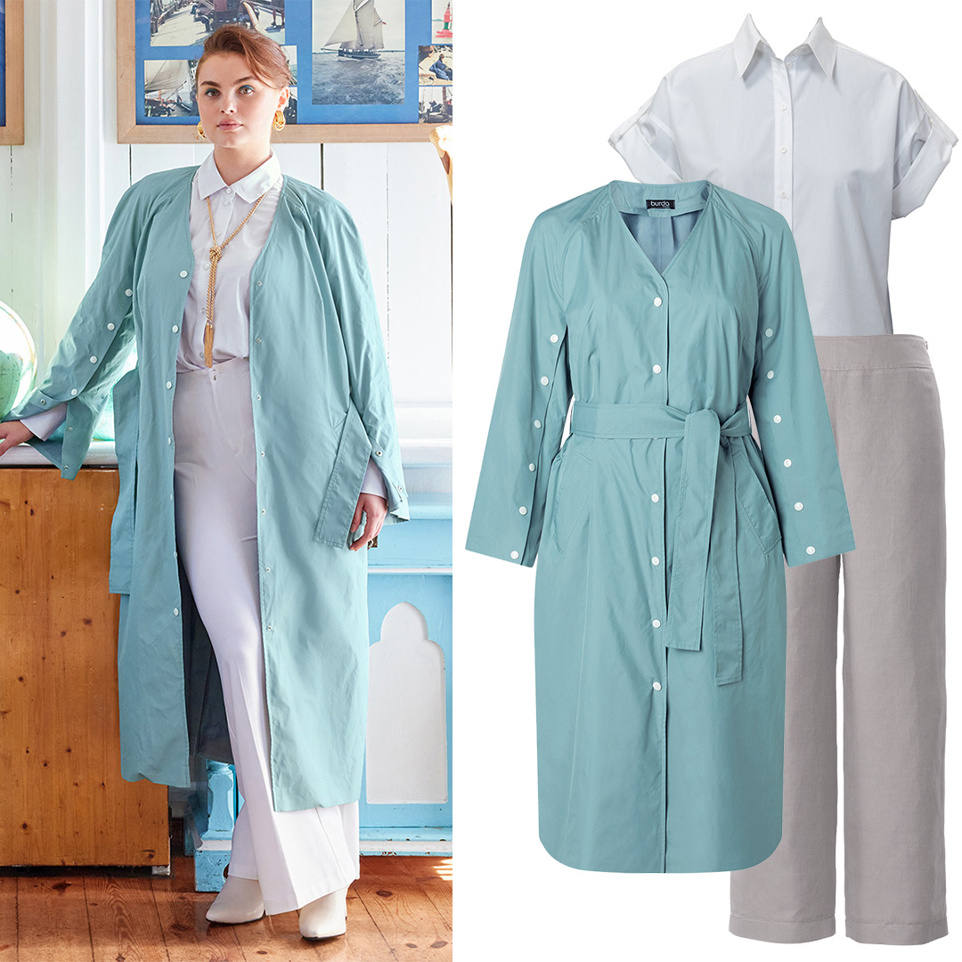 Пояс і кишені з листочками лишаються, але завдяки відсутності коміра тренчкот має легший і більш повітряний вигляд. Рукави оздоблені застібками з цілого ряду кнопок: це означає, що їх можна носити з високими розрізами. Зручно, якщо вниз ви вдягли блузку або сукню, які легко мнуться. Біла блузка має подовжену лінію плечей і одвороти на рукавах, зафіксовані патами.