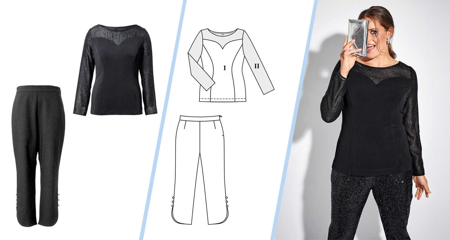Суперлегко і суперстильно! Ця блузка належить до швидких проєктів, але має трендові деталі, такі як ефект корсета і звабливі шифонові вставки. Глибокі бокові розрізи брюк прикрашені ґудзиками у вигляді переливчастих перлин. Окрім цих деталей, наша модель цілком стримана, тому дозволяє носити яскраві аксесуари, не перевантажуючи образ.