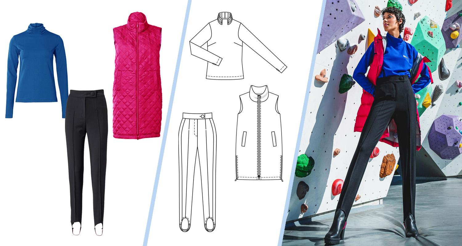 Нагадують лижні штани 70-х років: високо посаджені легінси із застроченими складками-стрілками. Стильна деталь: штрипки по низу із настроченими оздоблювальними стрічками неоново-рожевого кольору. Незамінна базова модель – як тоді, так і зараз – пуловер з високим коміром! Однак комір цієї моделі призборюється не під час носіння, а має готову рівномірну зборку по швах.