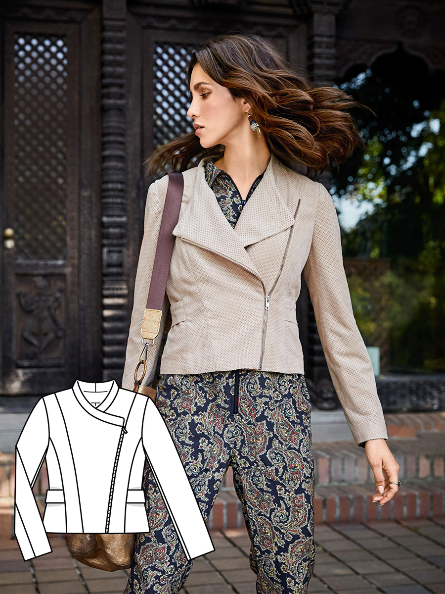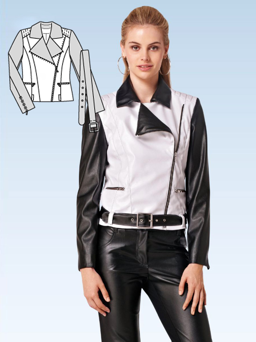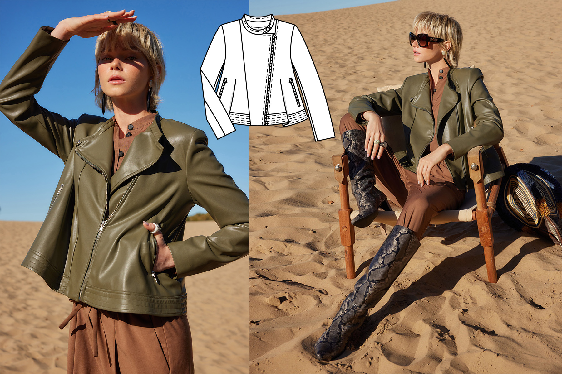 Якщо байкерський жакет із коміром-стойкою та асиметричною застібкою-блискавкою пошити з м’якої тканини під замшу з перфорацією, він набуває дещо іншого характеру. Бокові пати, прихоплені у рельєфні шви пілочок та спинки, посилюють акцент на талії.