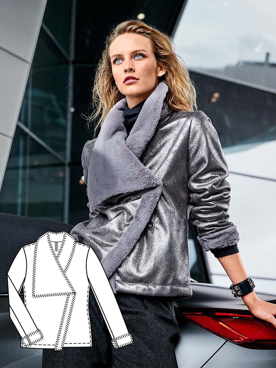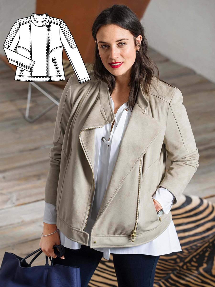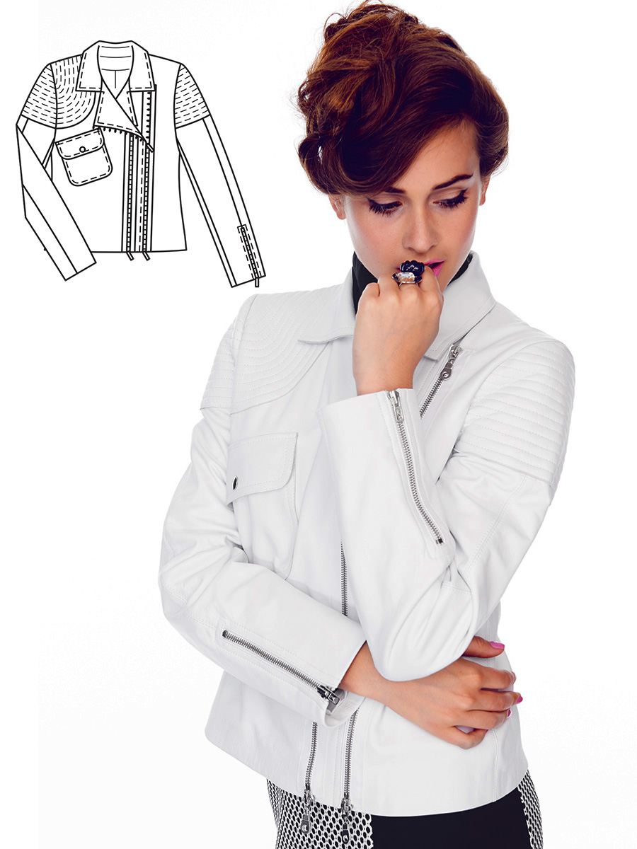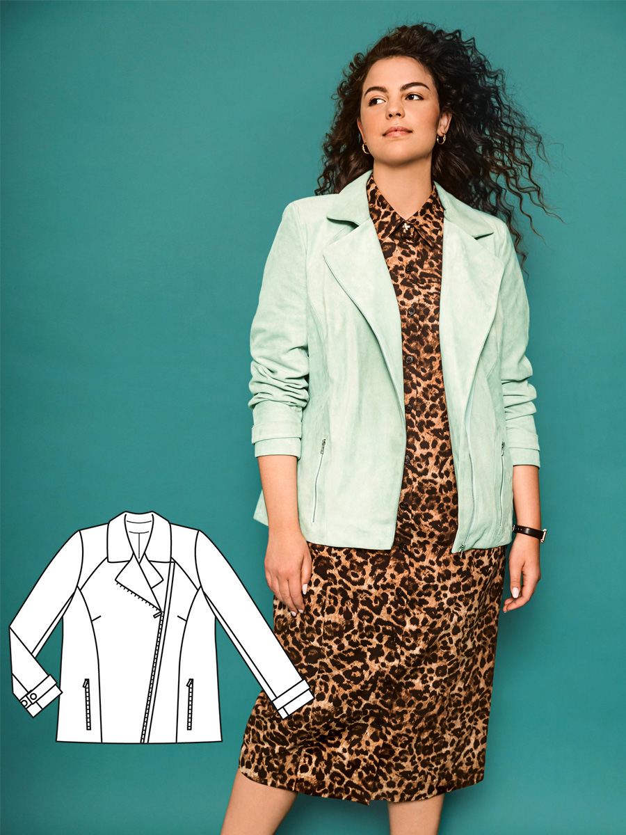 Якщо байкерський жакет із коміром-стойкою та асиметричною застібкою-блискавкою пошити з м’якої тканини під замшу з перфорацією, він набуває дещо іншого характеру. Бокові пати, прихоплені у рельєфні шви пілочок та спинки, посилюють акцент на талії.