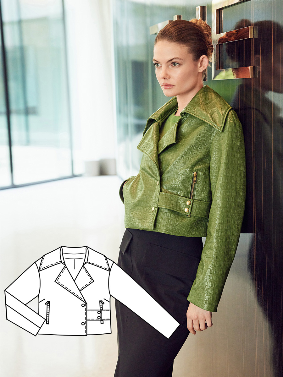 Серед модних обновок на весну ми впевнено радимо куртку-косуху! Представлена на обкладинці журналу Burda 2/2026, вона яскраво демонструє, як класичний фасон адаптується до сучасних вимог стилю та комфорту. Родзинка цієї моделі зі штучної шкіри - злегка розкльошений силует, який надає образу актуальної динаміки, не жертвуючи універсальністю. Таке свіже конструктивне рішення створює витончену жіночну форму без зайвої агресивності крою. Колір скошеної трави вирізняє цю куртку серед звичних чорних, білих або бежевих варіантів.