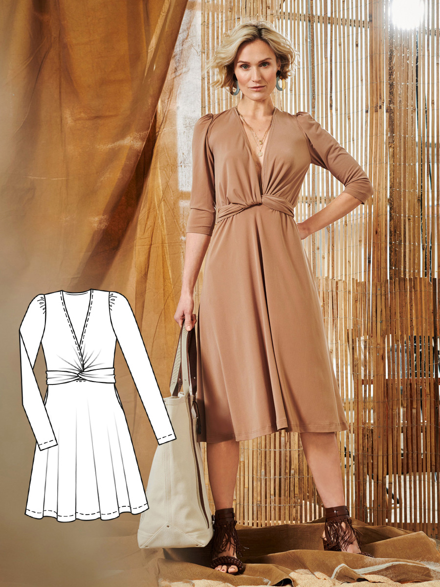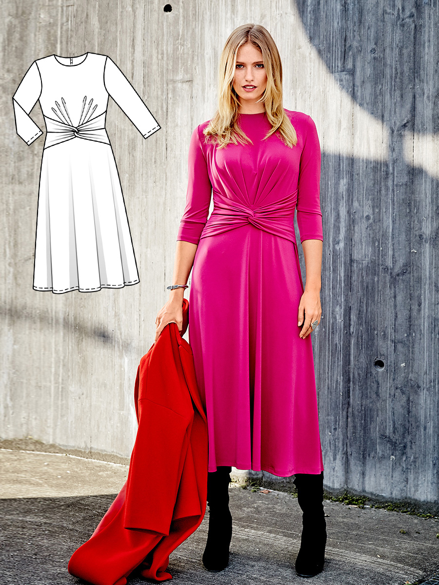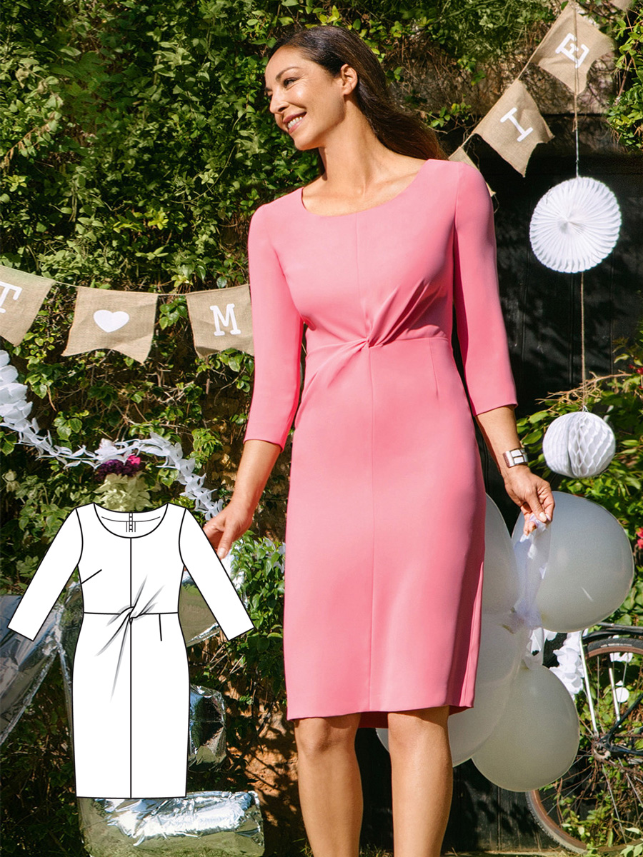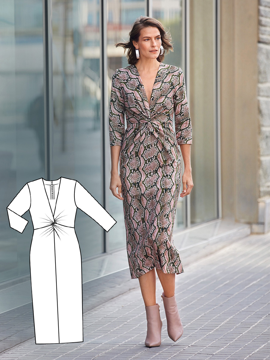 Сукня з обкладинки Burda 11/2022 привертає увагу оригінальною драпіровкою-вузлом на вирізі горловини. Завдяки цій деталі лаконічна сукня-футляр, пошита зі стриманої тканини у смужку в чоловічому стилі, стає насправді універсальною: вона однаково доречна і в офісі, і на вечірці.