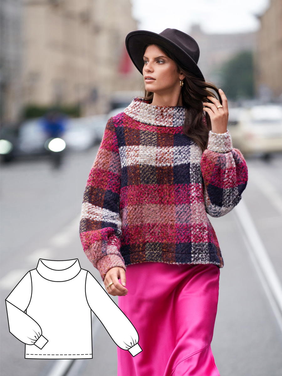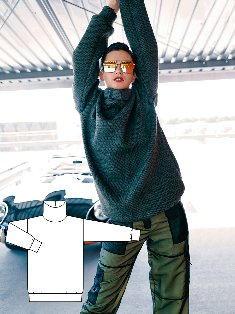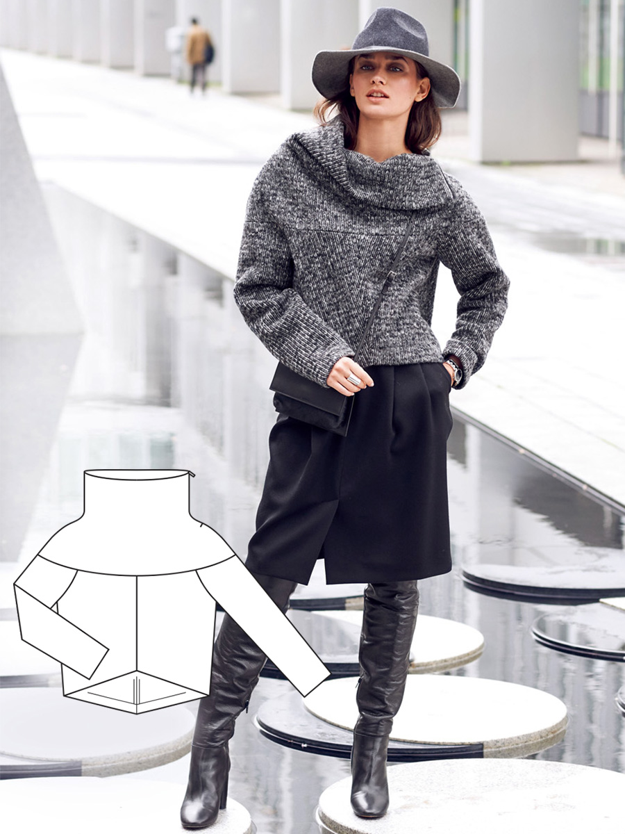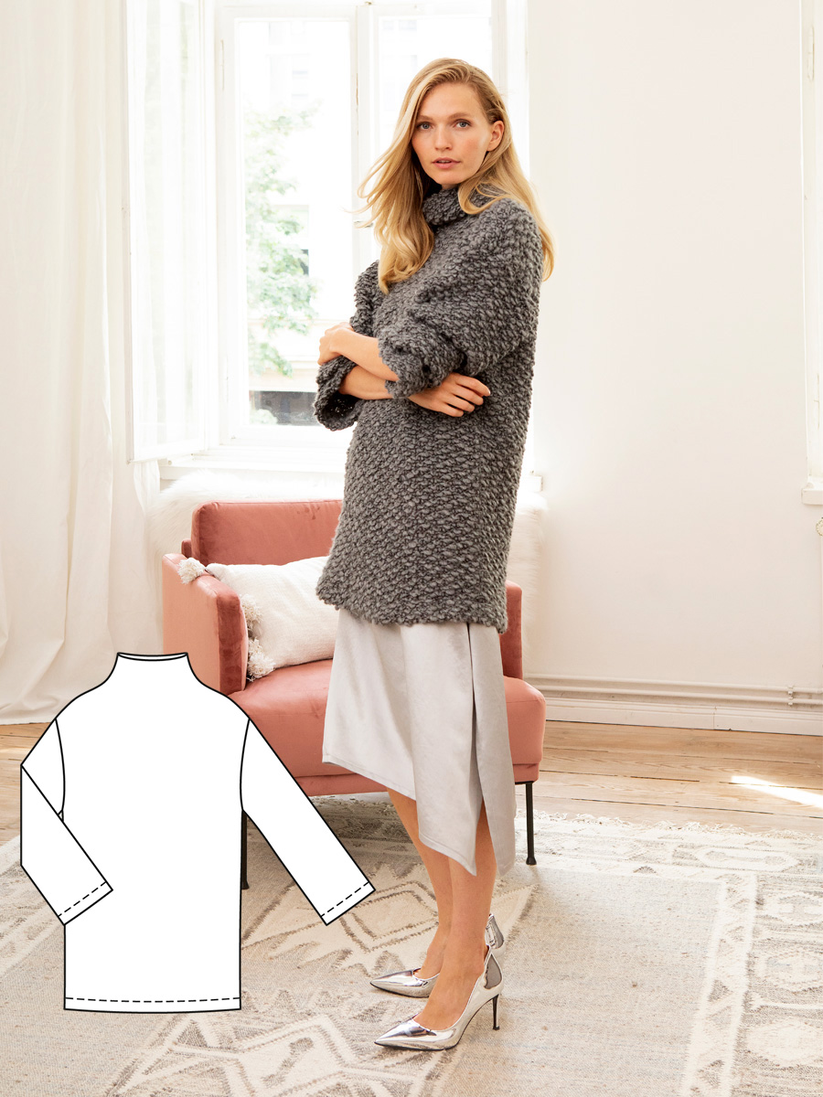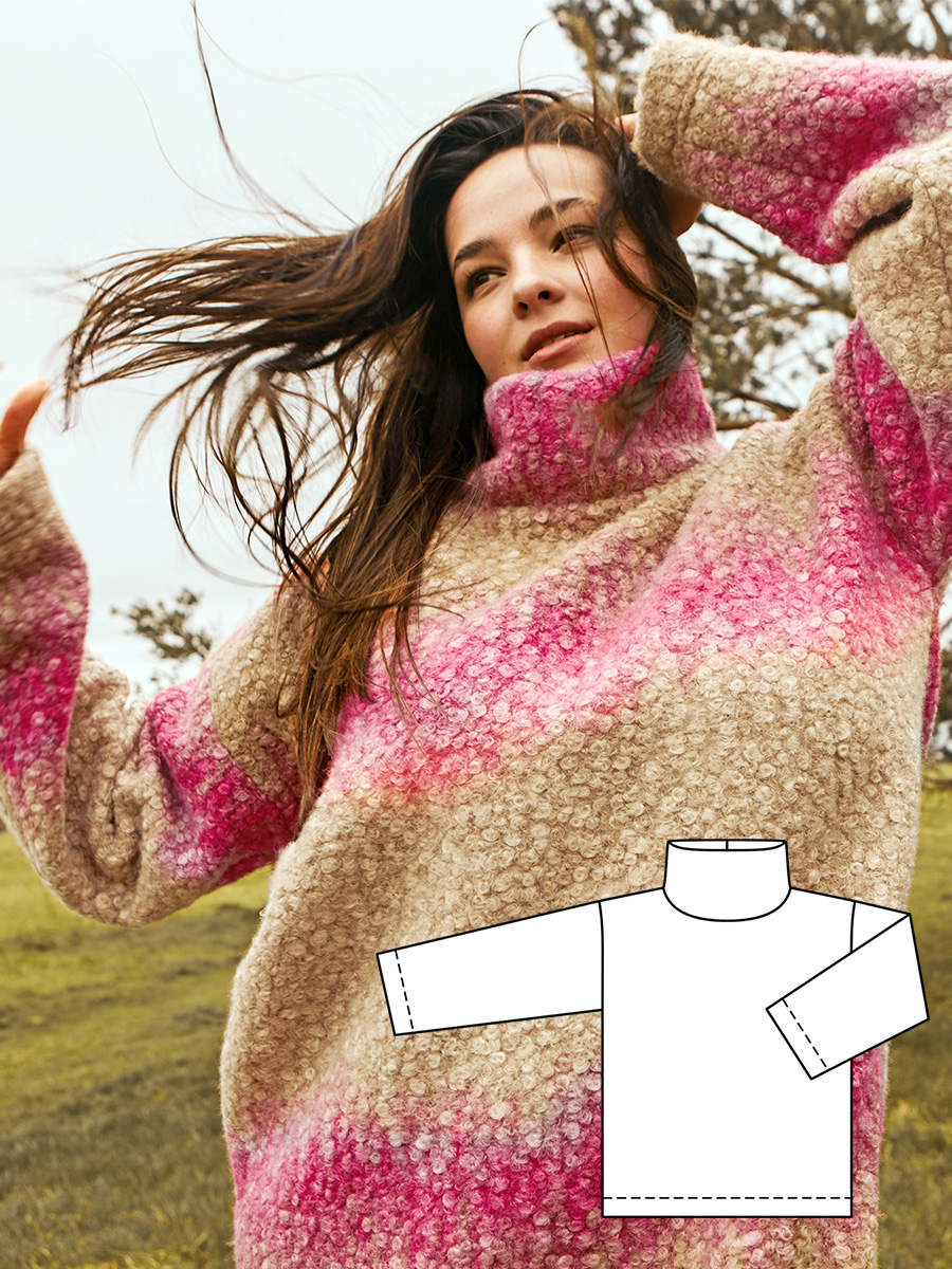 Швидко отримати трендову річ? Легко з цим пуловером! В’язане полотно букле затишно м’яке, високий комір робить модель ультратеплою. А шити цей стильний пуловер легко і швидко. Порада: у видовженому варіанті викрійки отримаєте розкішну теплу сукню.