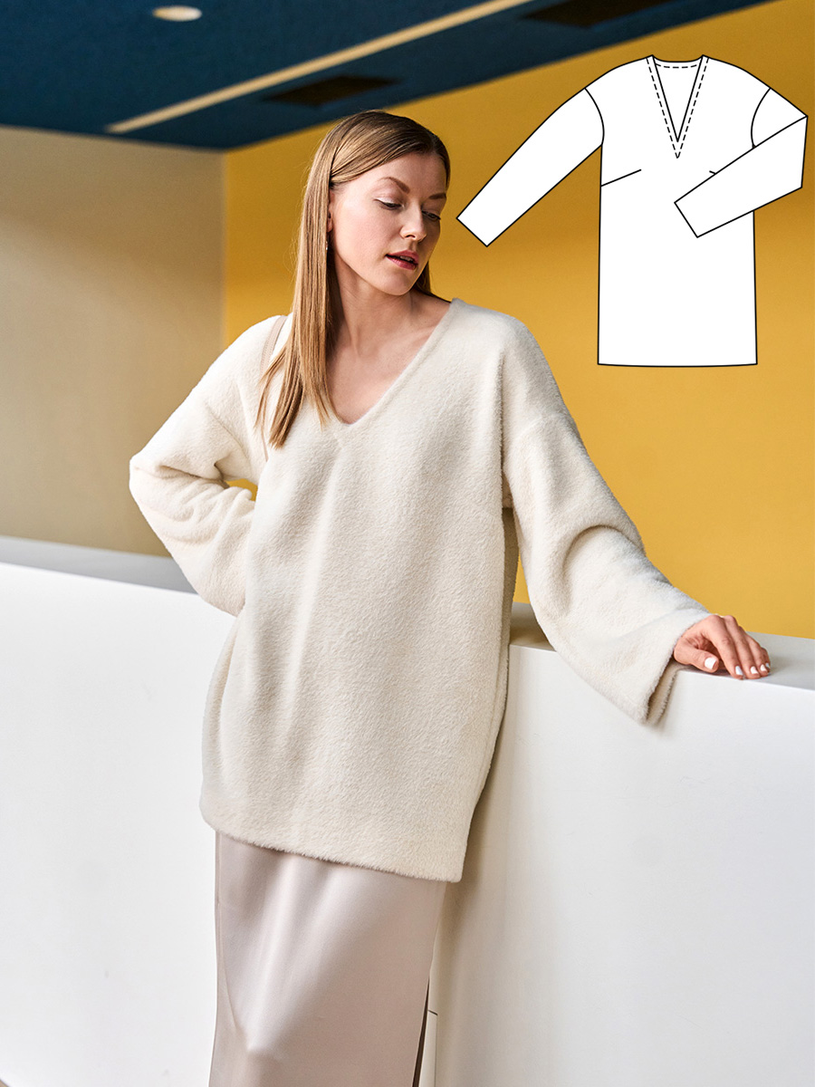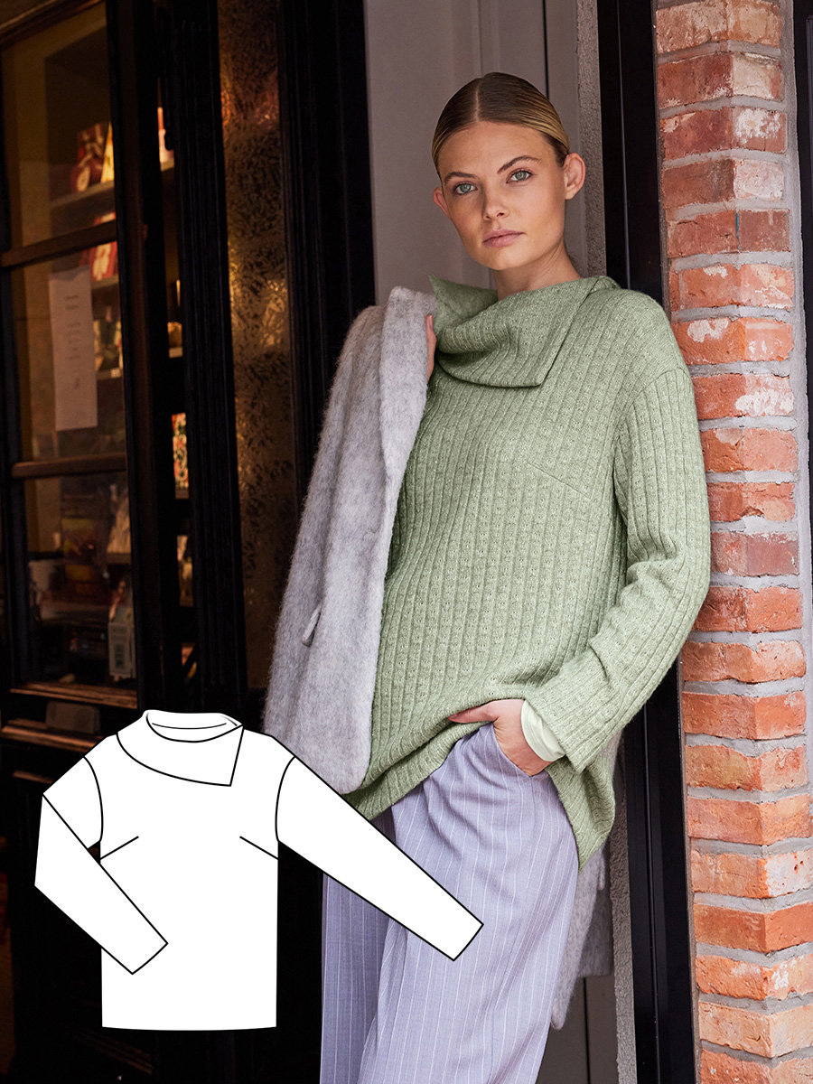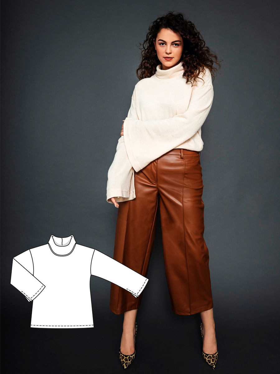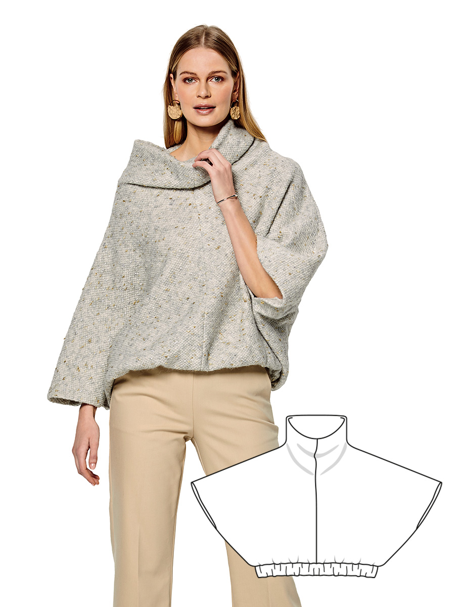 Швидко отримати трендову річ? Легко з цим пуловером! В’язане полотно букле затишно м’яке, високий комір робить модель ультратеплою. А шити цей стильний пуловер легко і швидко. Порада: у видовженому варіанті викрійки отримаєте розкішну теплу сукню.