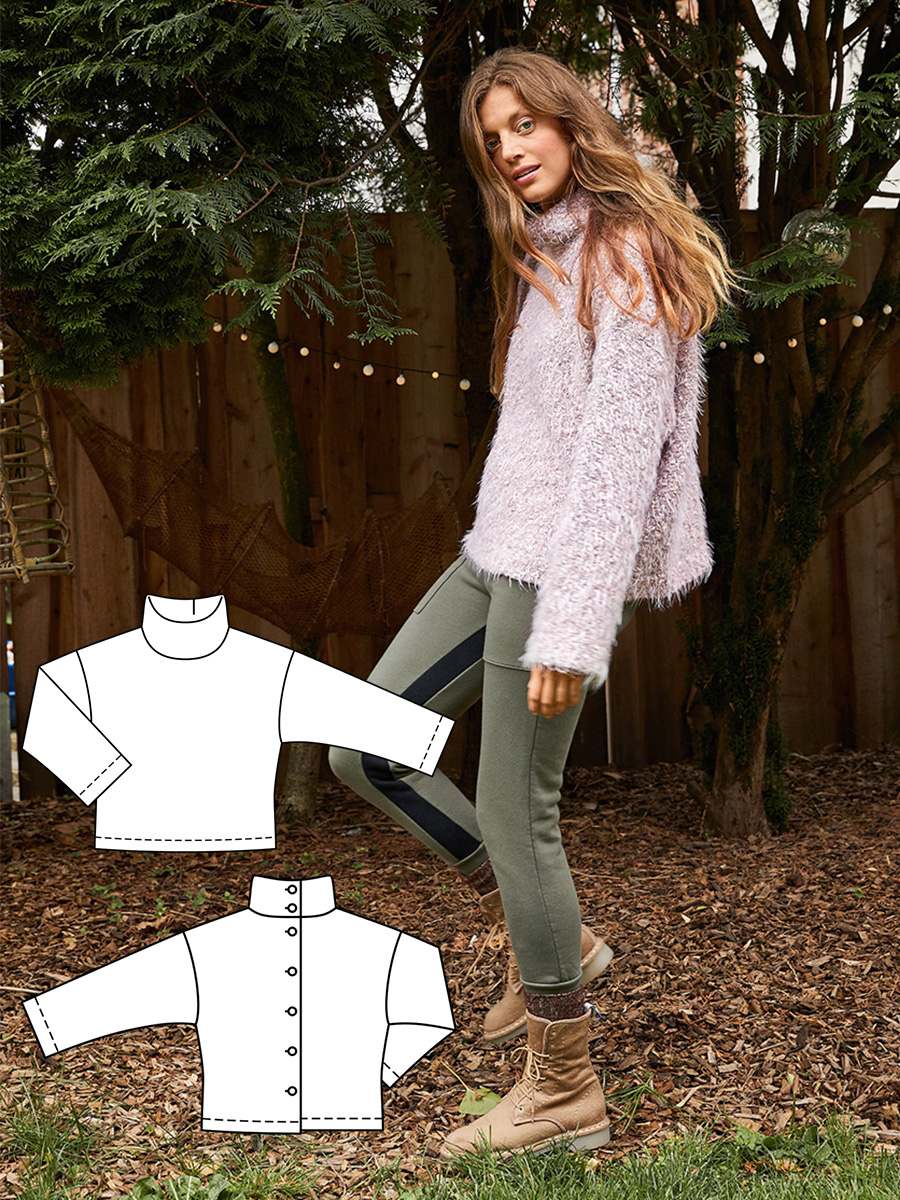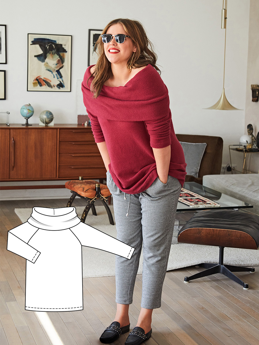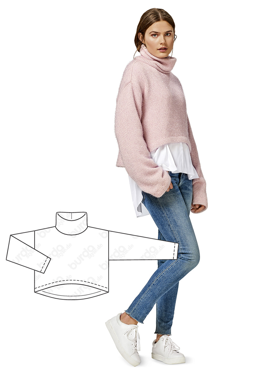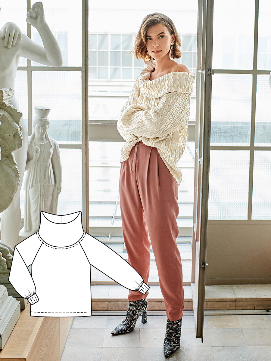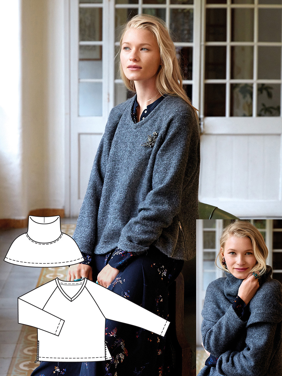 Швидко отримати трендову річ? Легко з цим пуловером! В’язане полотно букле затишно м’яке, високий комір робить модель ультратеплою. А шити цей стильний пуловер легко і швидко. Порада: у видовженому варіанті викрійки отримаєте розкішну теплу сукню.
