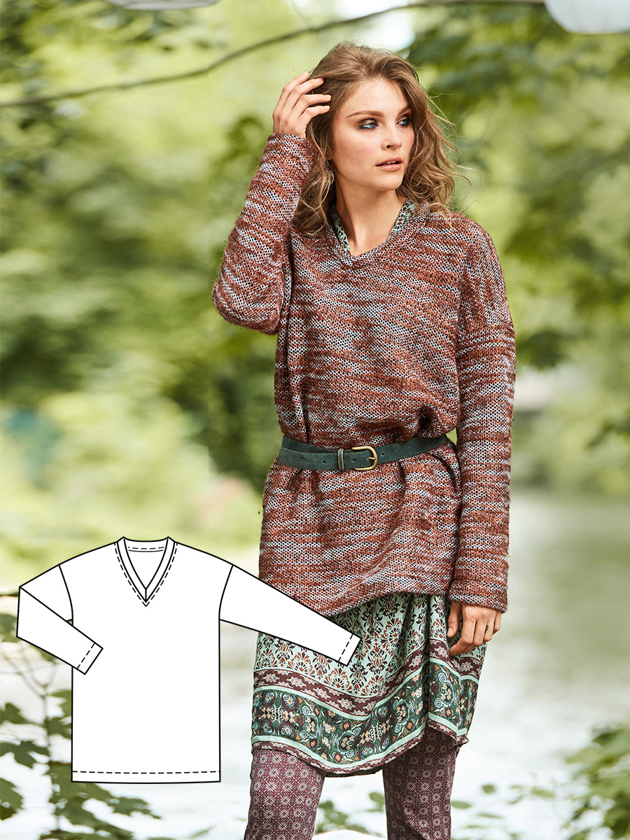 У такій довжині, як на фото, укороченій чи навіть видовженій до сукні: ця модель пуловера дуже різнопланова, як і ви, та гарантовано матиме чудовий вигляд і з принтом. Ідея: обробити виріз горловини різнокольоровими нитками на оверлоці.