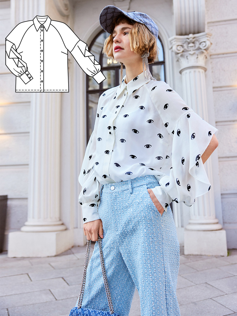 Для всіх, хто любить блузи! Ця модель має чудовий вигляд: сорочковий комір, планки із застібкою на ґудзики, високі бокові розрізи, оригінальні широкі манжети із зав’язками. При цьому шити її надзвичайно легко. Ідеальний варіант!