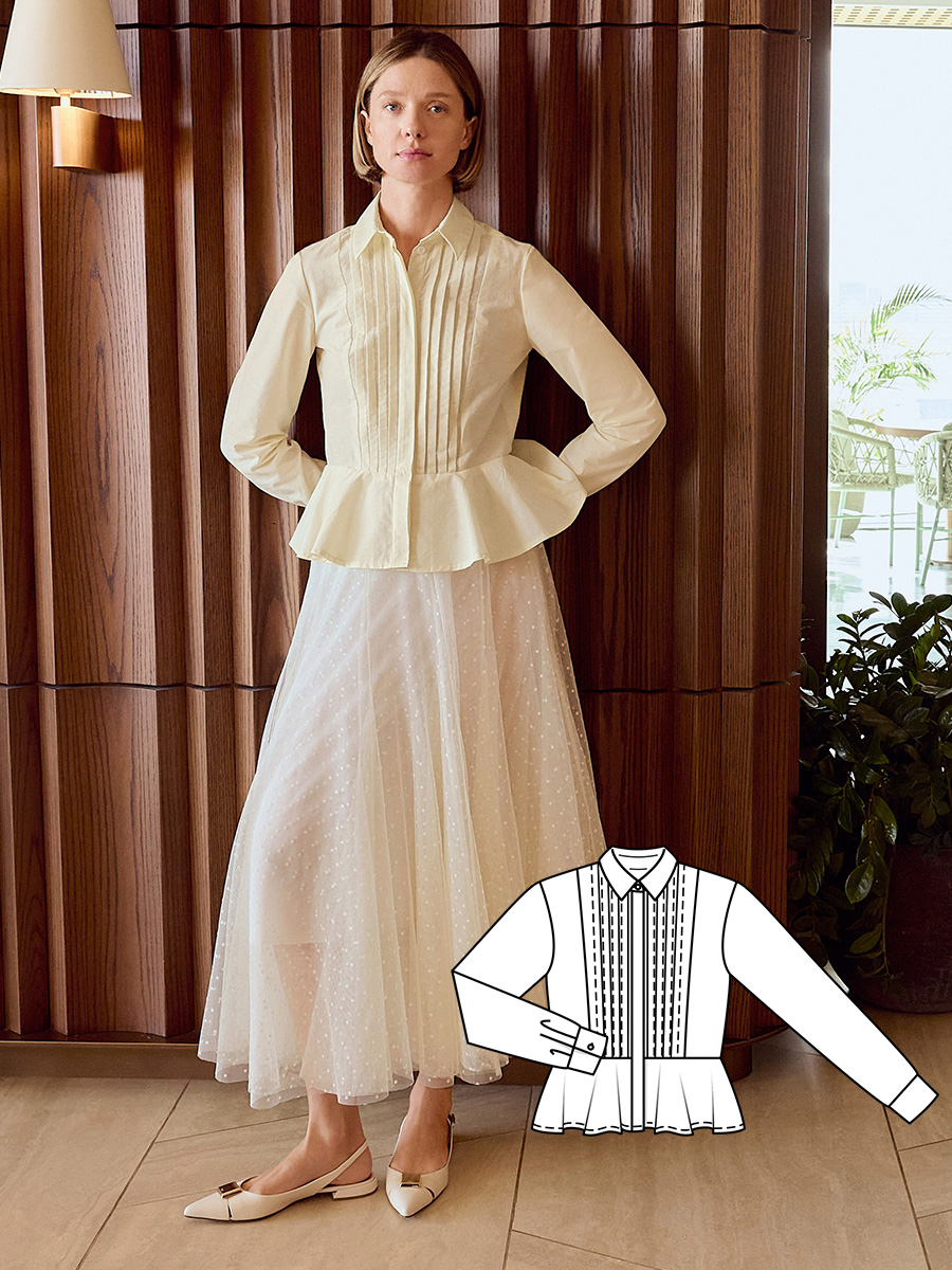 Ефект пластрона з вузькими складками, баска та батист ніжного жовтого відтінку – жодна інша блузка навряд чи могла б мати більше модних деталей. Рельєфні шви ідеально підкреслюють фігуру.