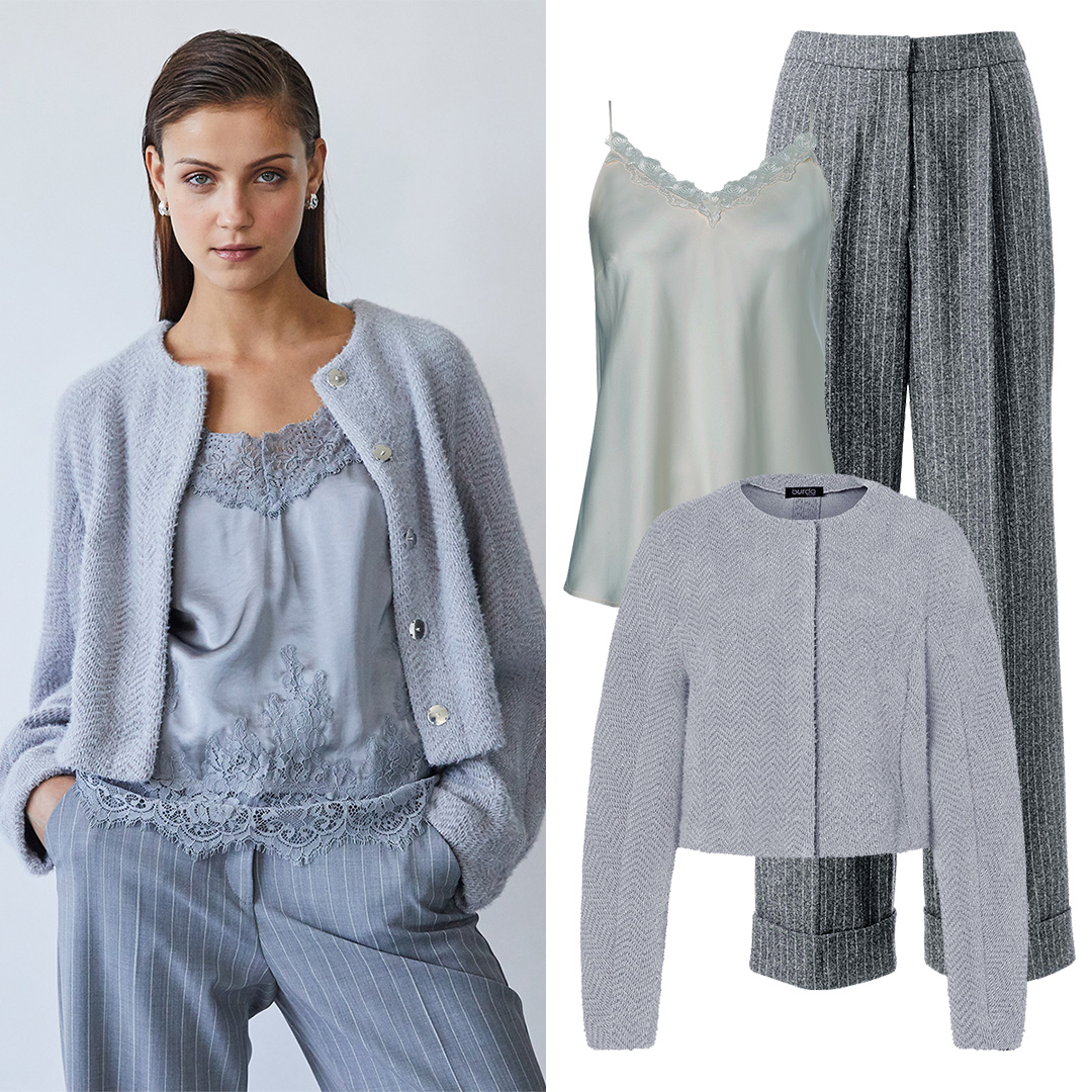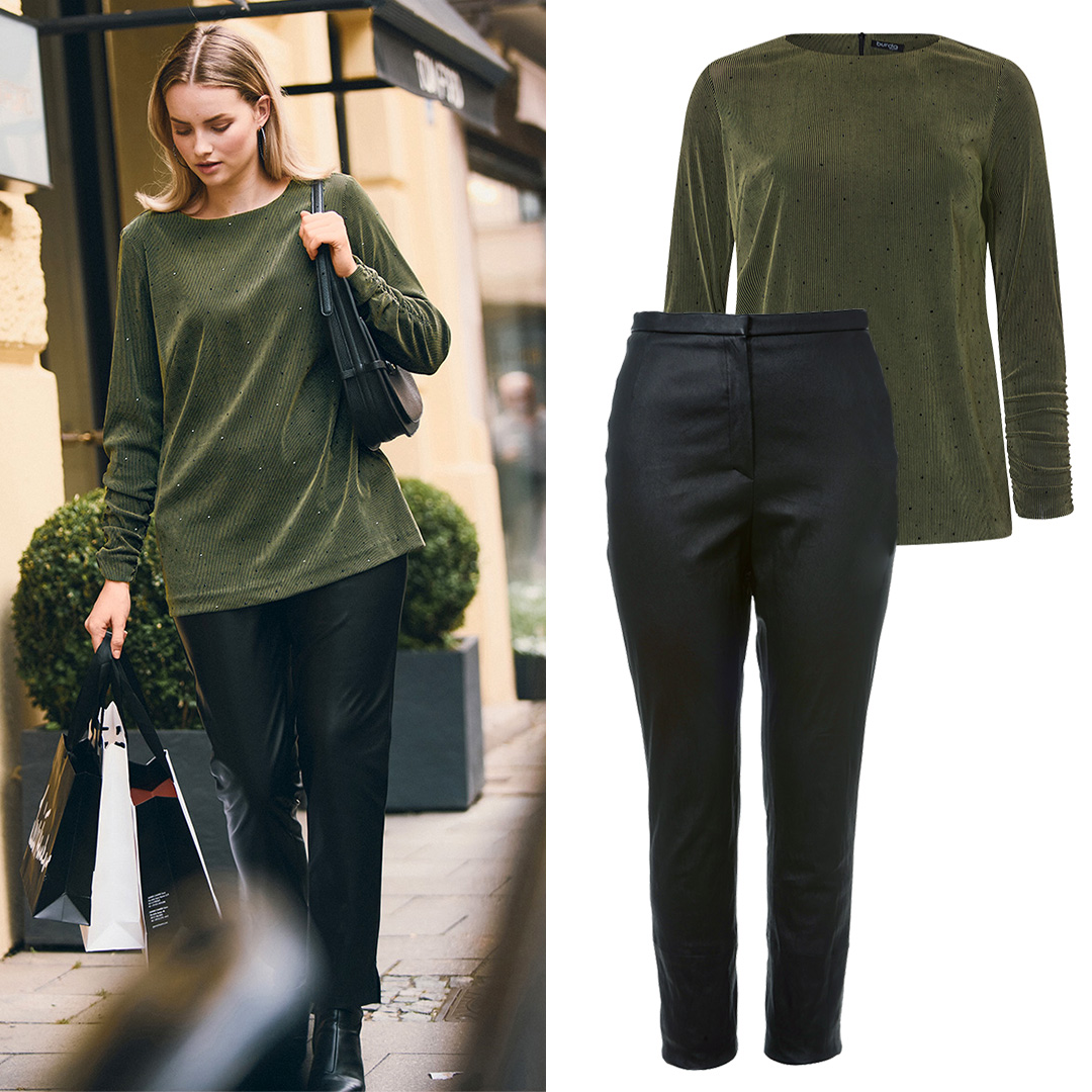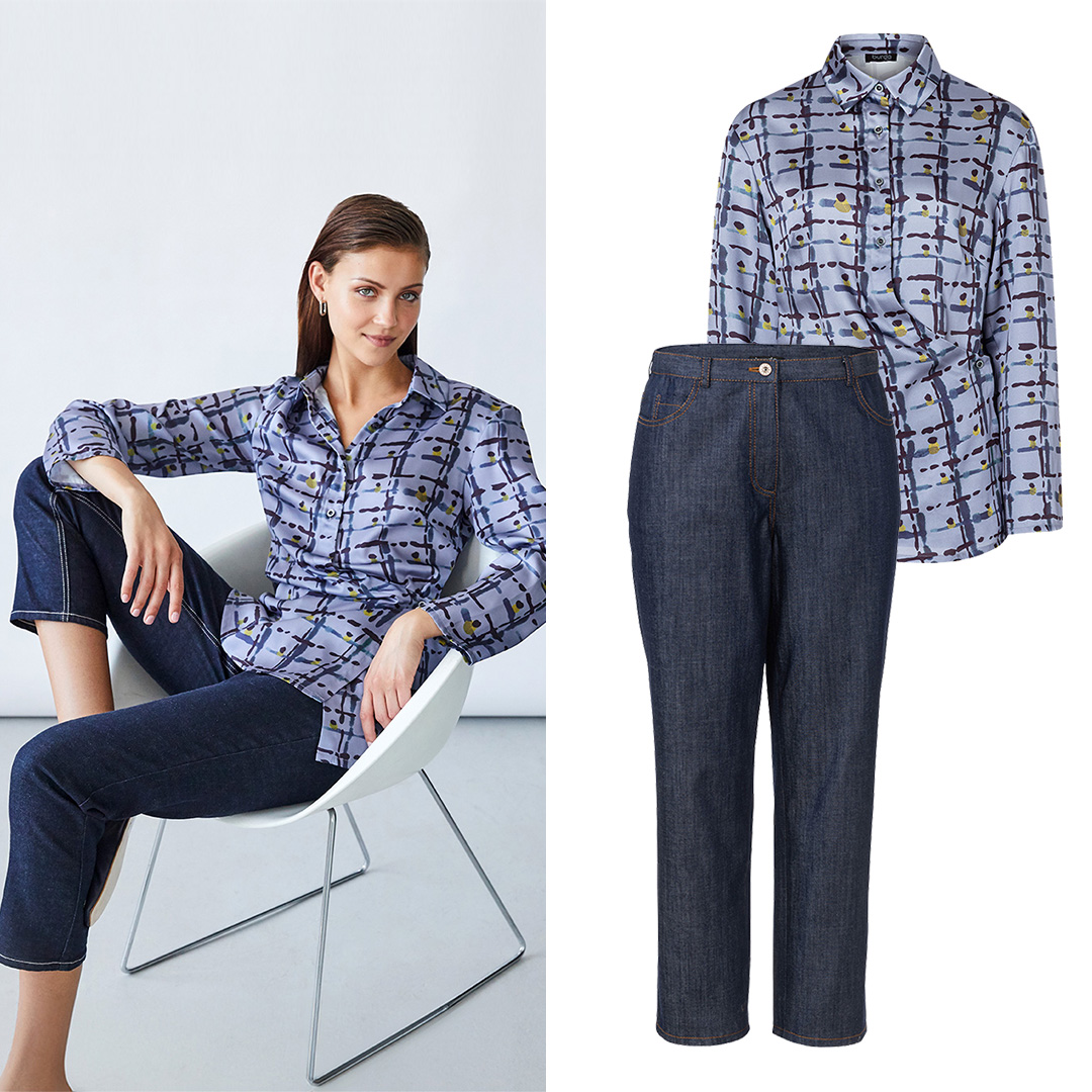 Блузка з вишуканим акцентом: задрапірована пілочка та асиметрична застібка створюють елегантний ефект запаху. Класичним доповненням тут є комір у сорочковому стилі. Класична модель джинсів «5 кишень» завжди актуальна! А злегка завужені вкорочені штанини поліпшують пропорції.