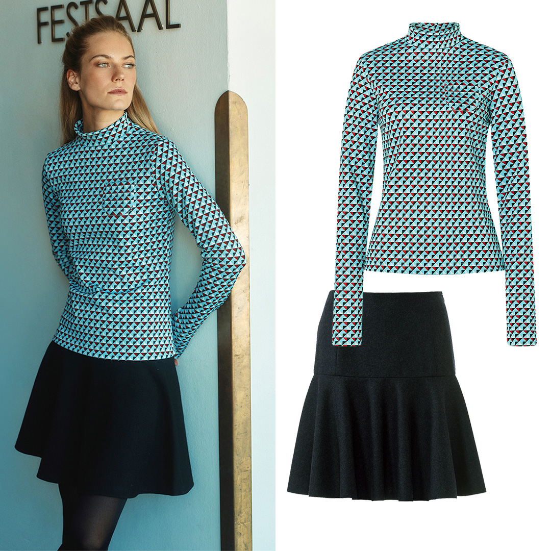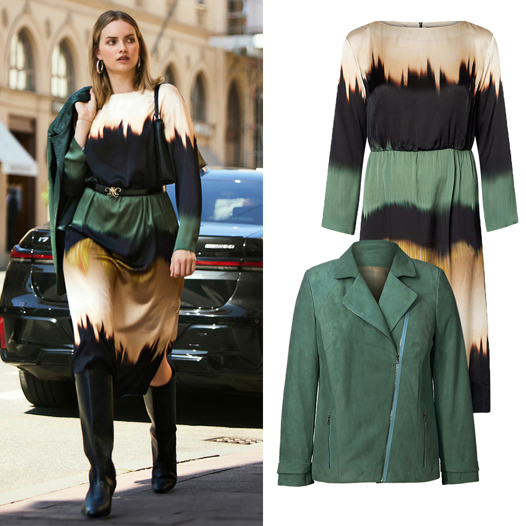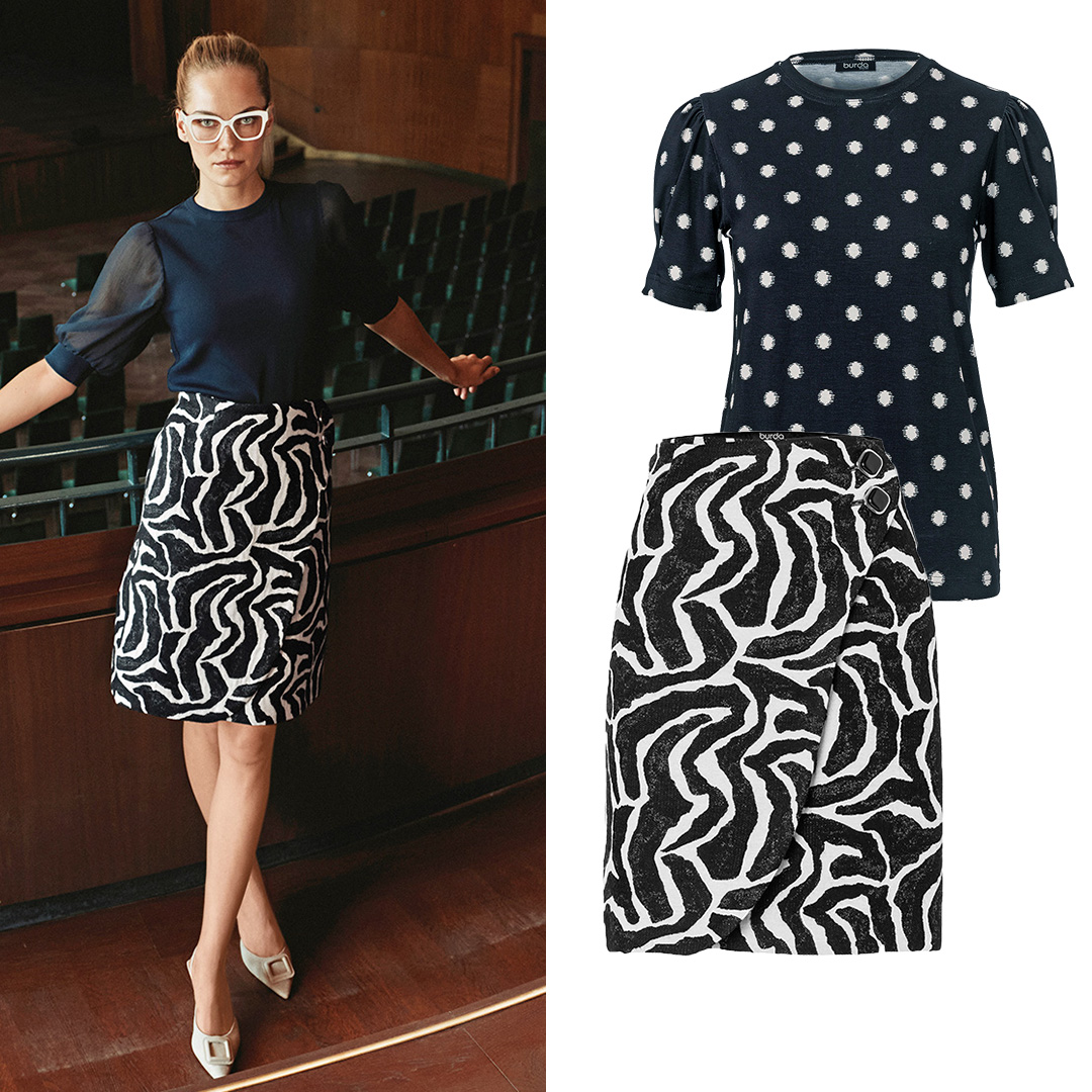 Проста, елегантна і витончена: спідниця з запахом і м’яким А-силуетом сидить трохи нижче талії і приваблює заокругленим краєм із декоративними ґудзиками. Сучасна класика, яка впевнено поєднує офісний шик і вечірню елегантність. Короткі рукави блузки призборені по окату і завужені донизу за допомогою елегантних складок.