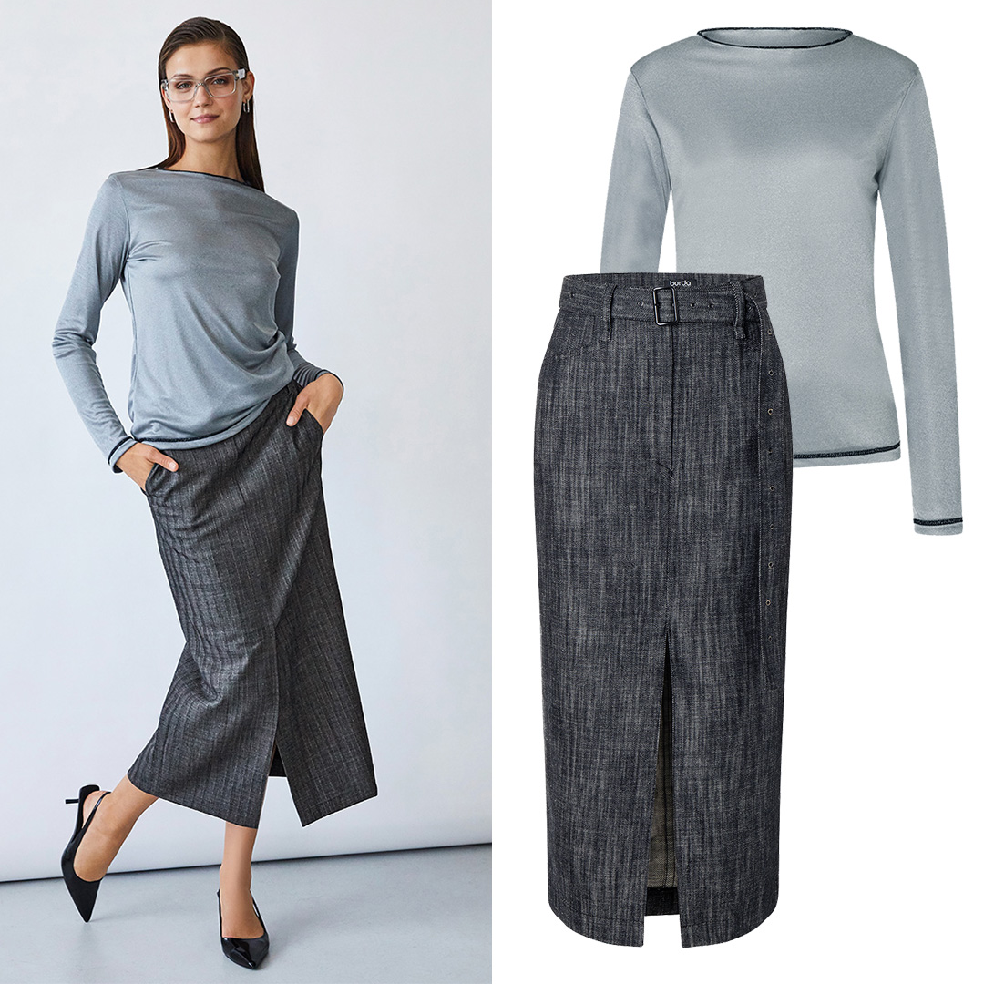 Найкращий базовий та універсальний партнер: цей простий пуловер із круглим вирізом горловини ідеально підходить для створення стильних ділових образів зі штанами та спідницями. Вузька спідниця міді з високим розрізом бездоганно підкреслює фігуру.